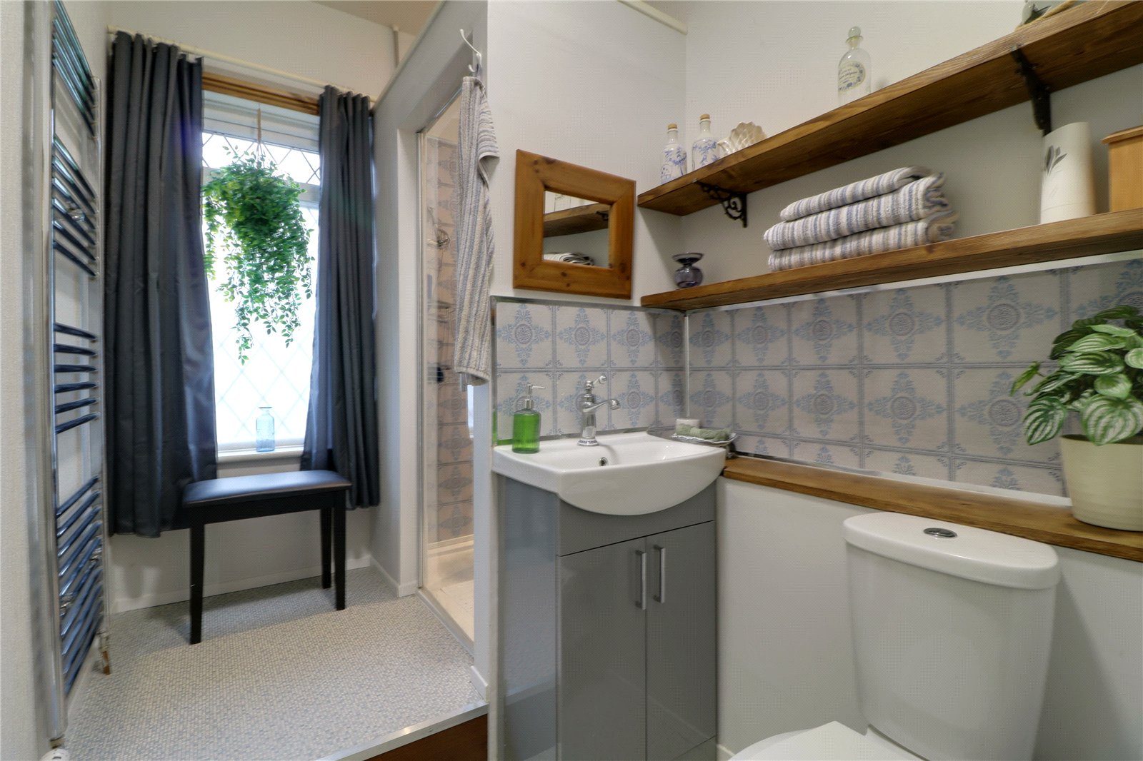 Annex Shower Room 5'7" x 9'2" (1.7m x 2.8m). With a front uPVC double glazed window providing a three piece suite comprising a low flush WC, a vanity wash hand basin with twin gloss fronted storage units with inset shelving with tiled splash backs, cushioned flooring, wall mounted chrome towel heater and a raised step leads through to a generous shower enclosure with overhead Mira electric shower and glazed screen and attractive tiled effect splash backs.