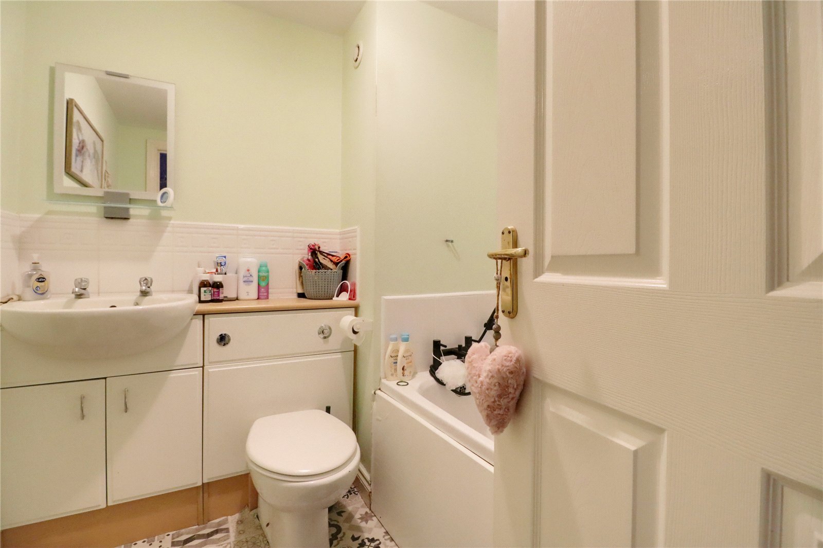 Family Bathroom 7'1" x 6'7" (2.16m x 2m). Modern suite in white comprising a close couple low flush WC adjoining vanity wash hand basin with tiled splash back, panelled bath with tiled surround and tiled effect flooring.