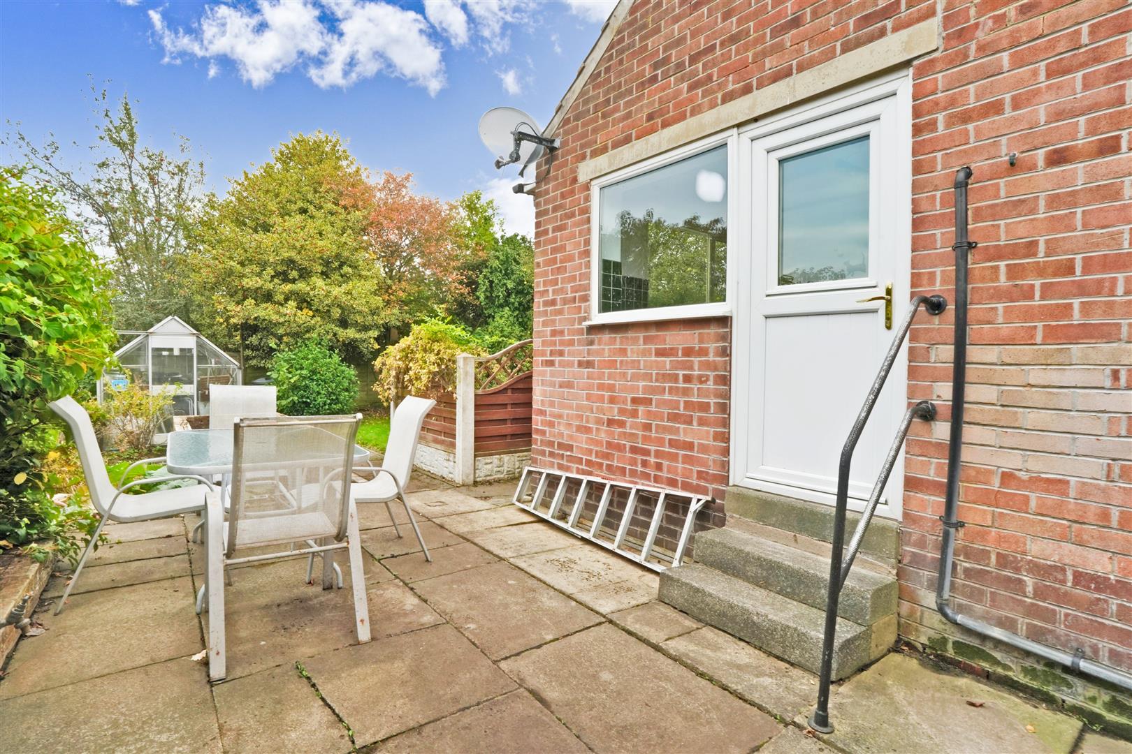 Rear Garden - Lawn and patio garden with raised flowerbeds. Fruit and holly trees. Greenhouse.
