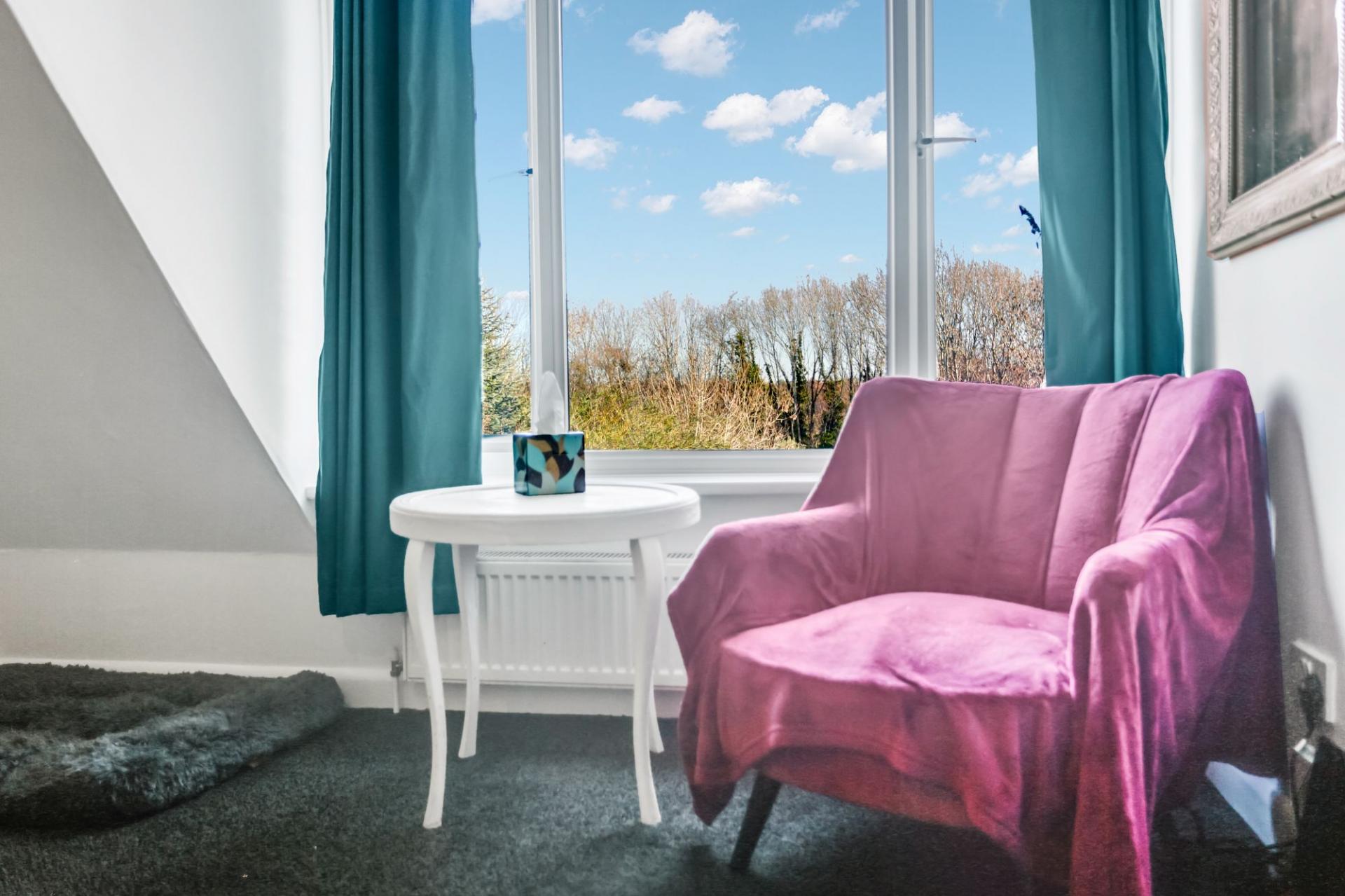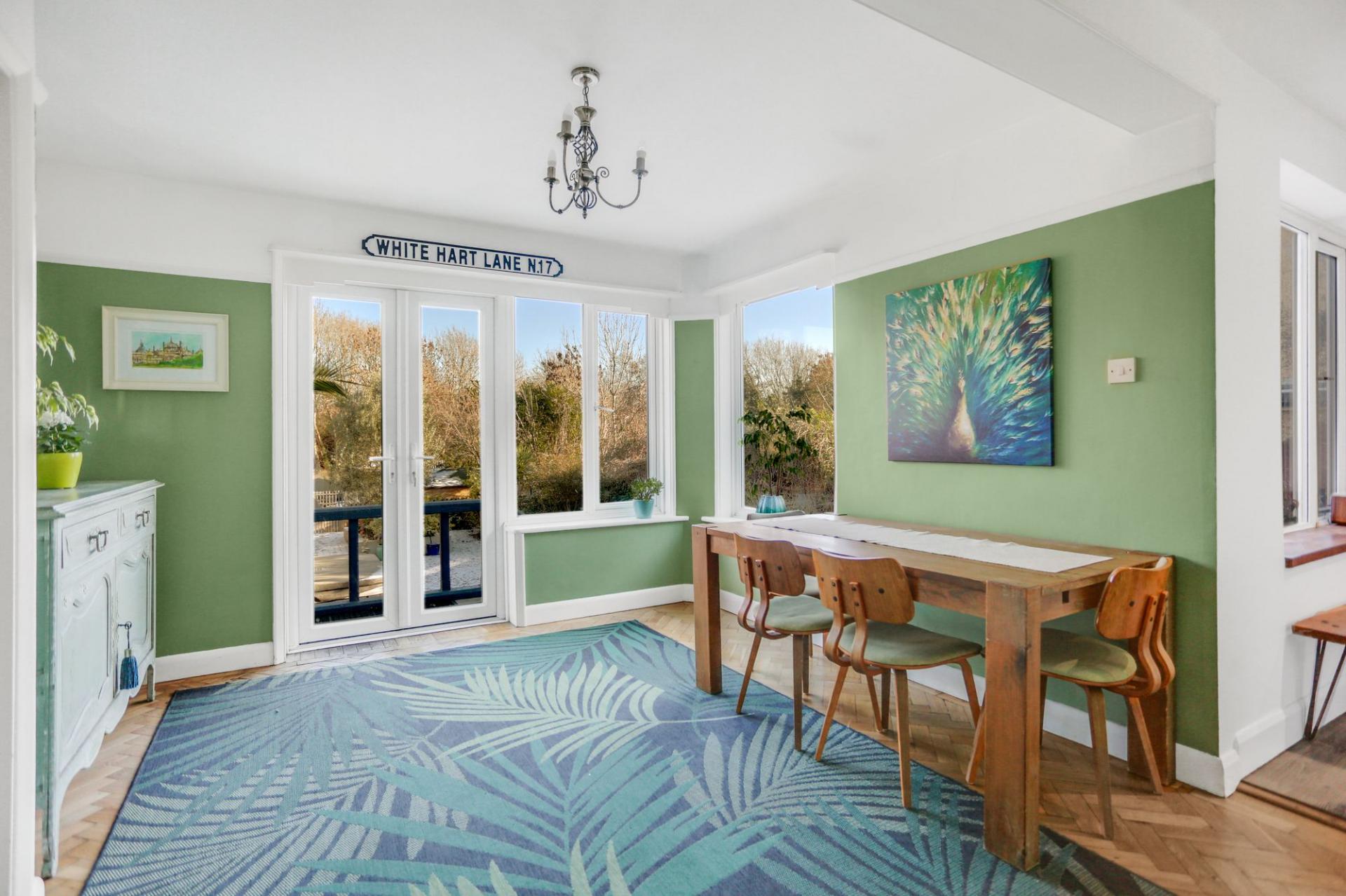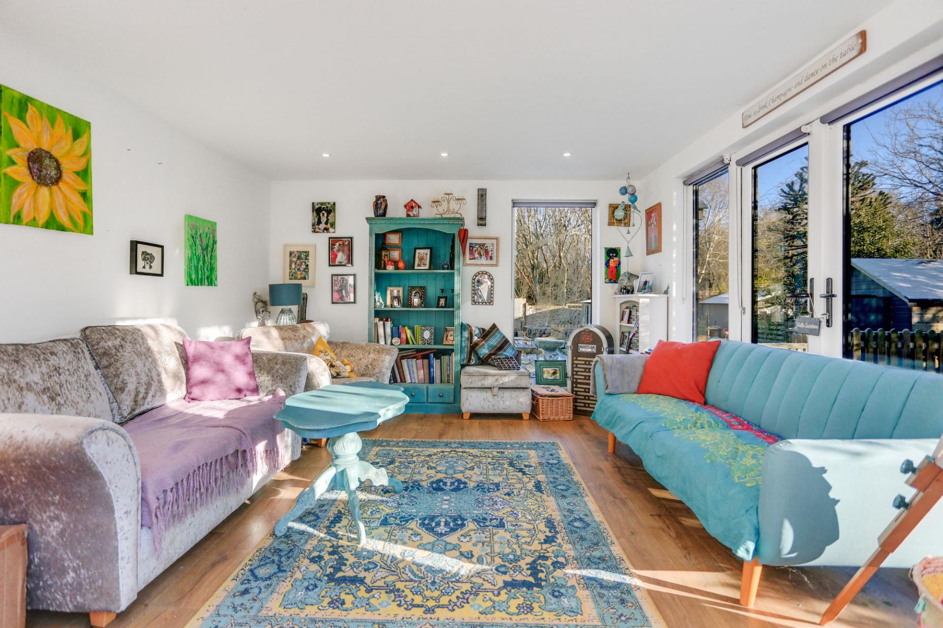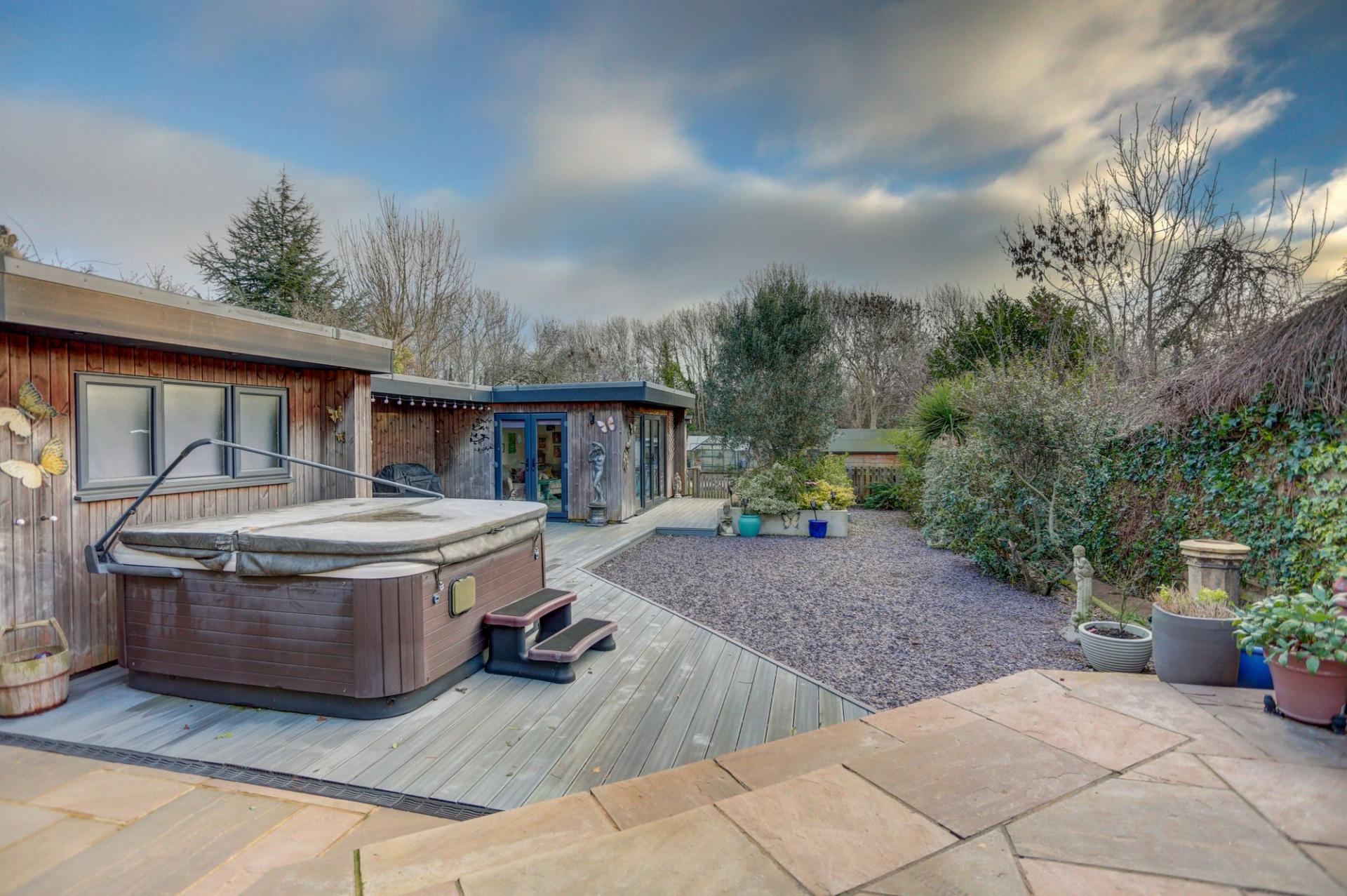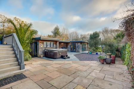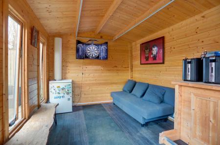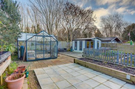The rear garden is a true highlight of the property, extending to approximately 140ft and providing a peaceful outdoor haven. It features a lawn with mature borders, a wonderful kitchen garden and a greenhouse. A well-proportioned U-shaped garden room currently incorporates an office area and large living space, but offers excellent versatility for a range of uses. At the far end of the garden, an additional garden room and seating area back onto woodland, creating a secluded spot to relax or entertain.