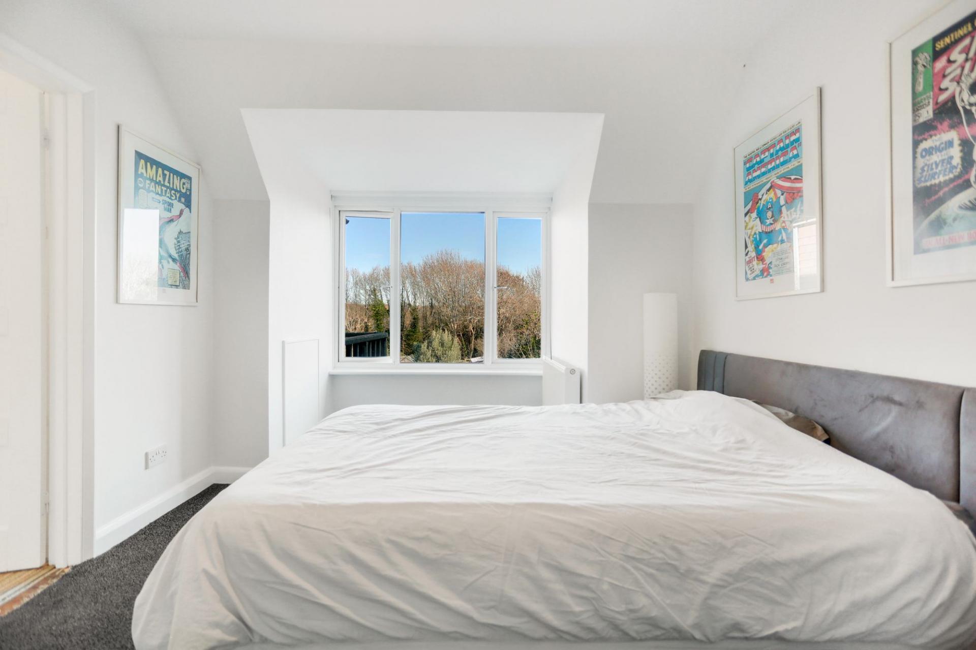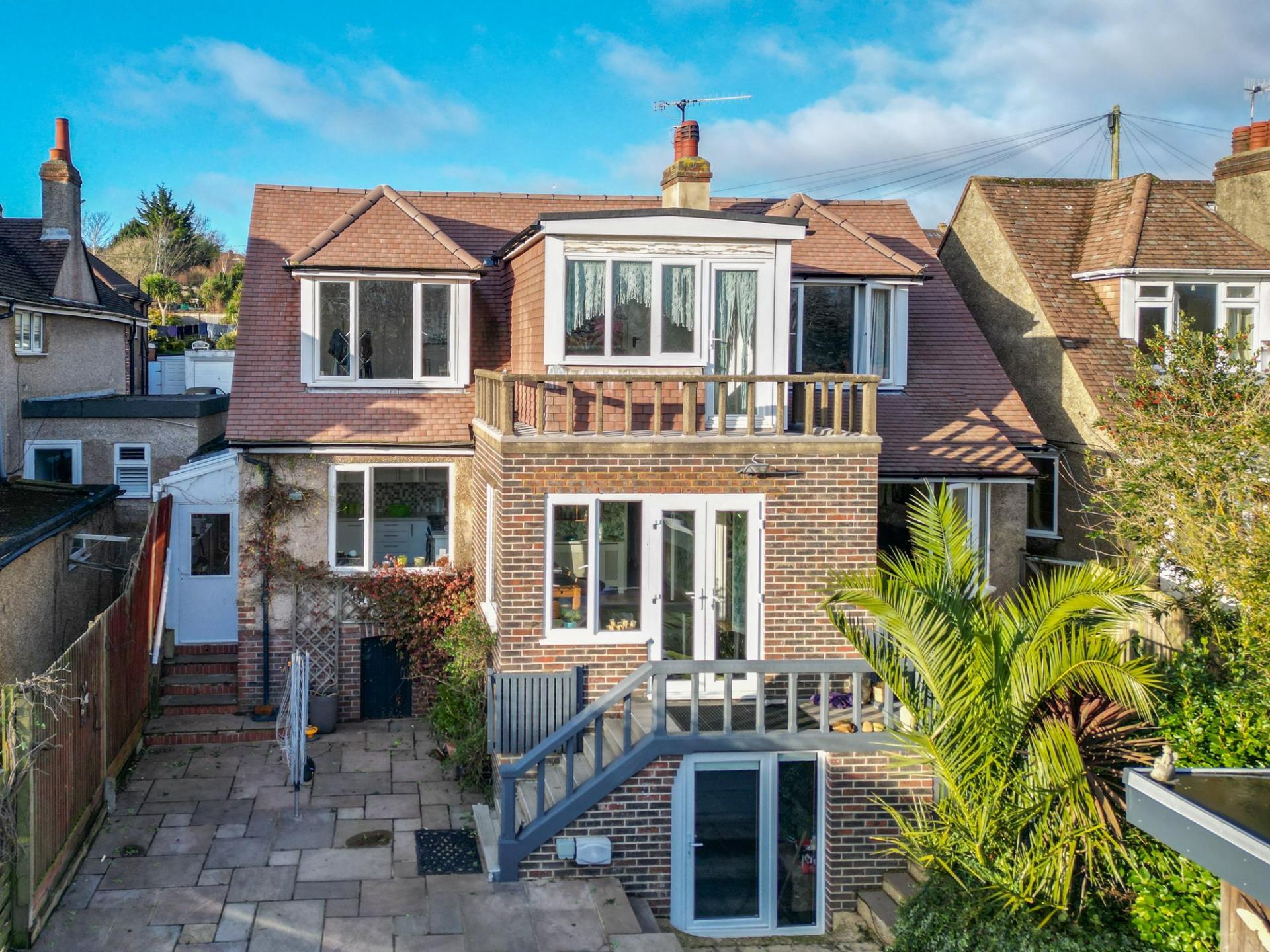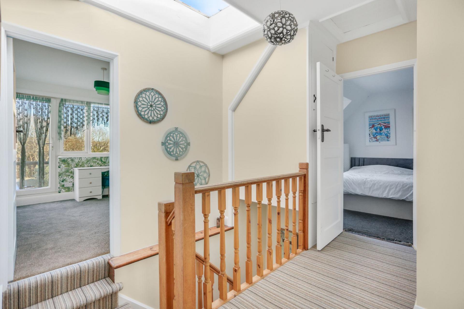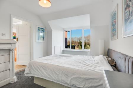 Upstairs, there are two well-proportioned double bedrooms with ample storage, along with a further bedroom that benefits from a balcony enjoying views over the garden and beyond.