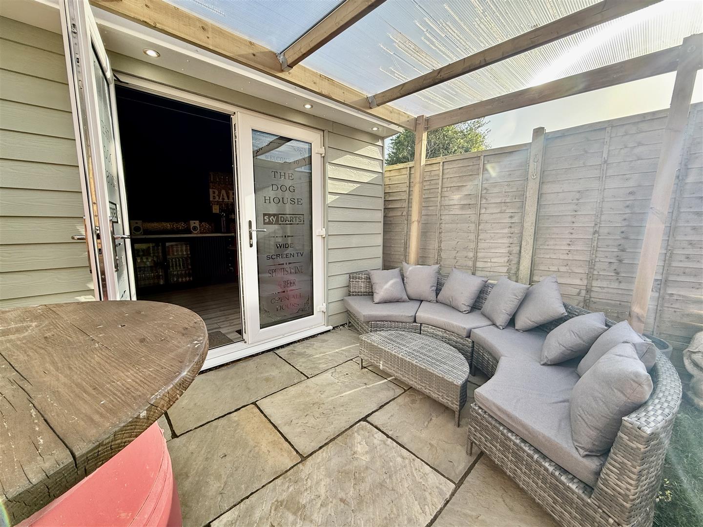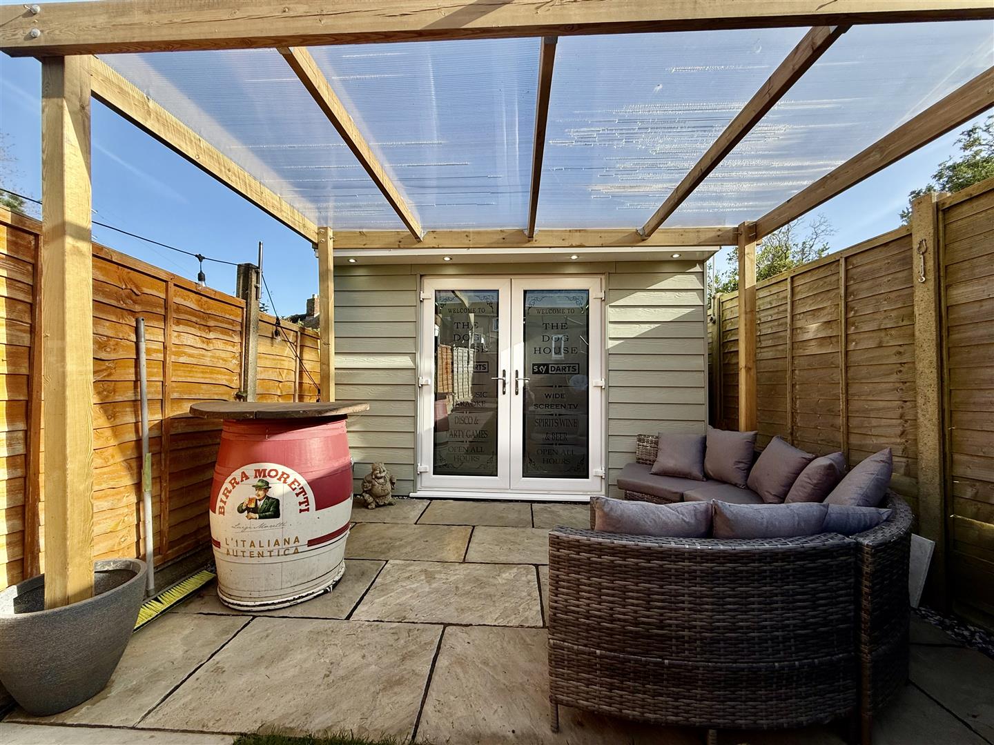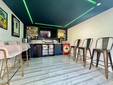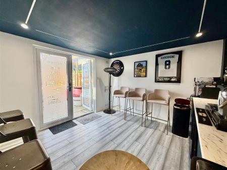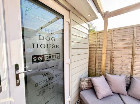 Outside, the garden truly steals the show! The predominantly south-facing garden is mostly laid to lawn, featuring a top paved BBQ area and a further undercover socializing space leading to the garden room. Aptly named the "Dog House", it currently serves as a bar and games room, making it ideal for entertaining guests, but it could also be converted into a work-from-home space if needed.