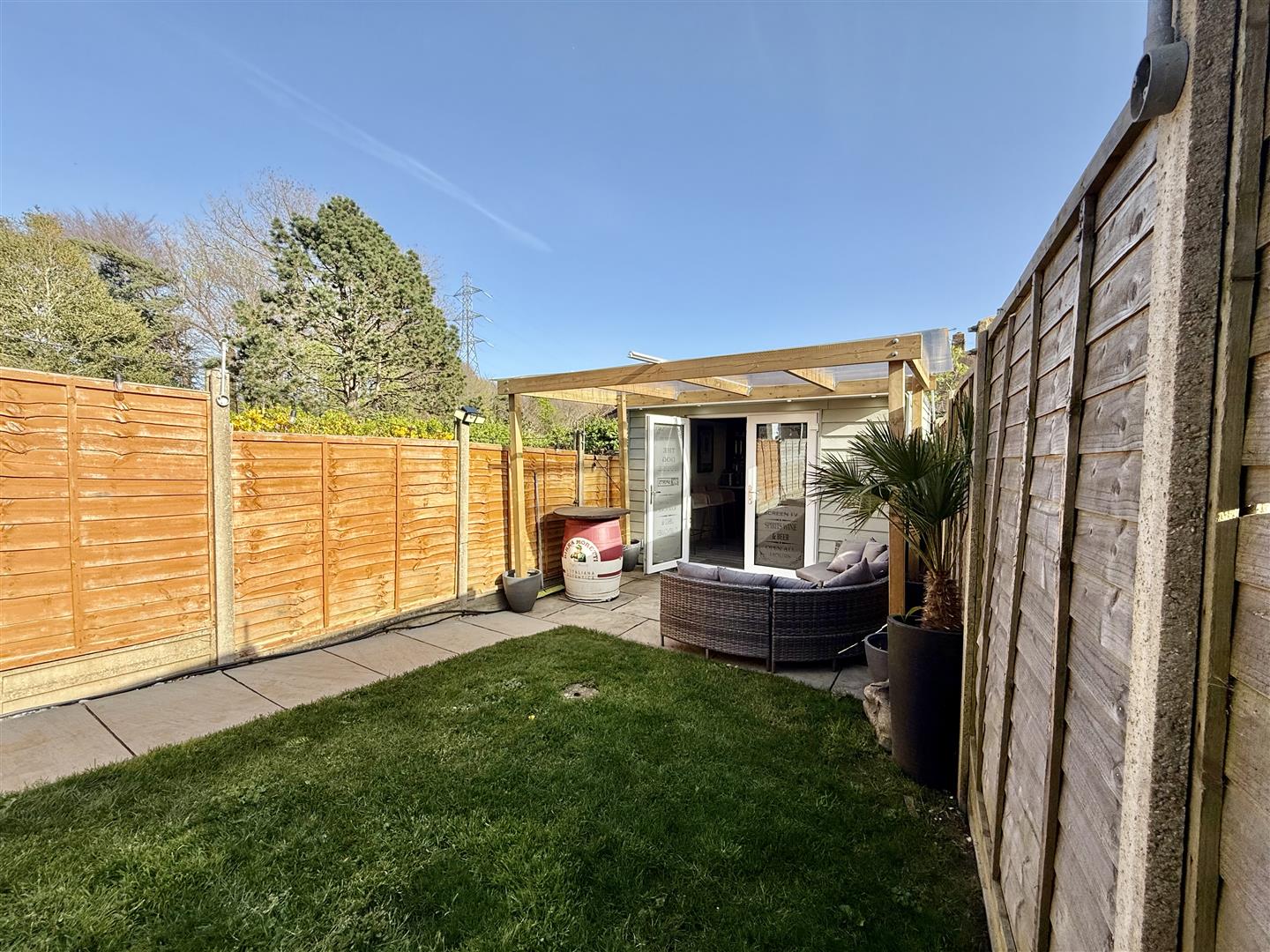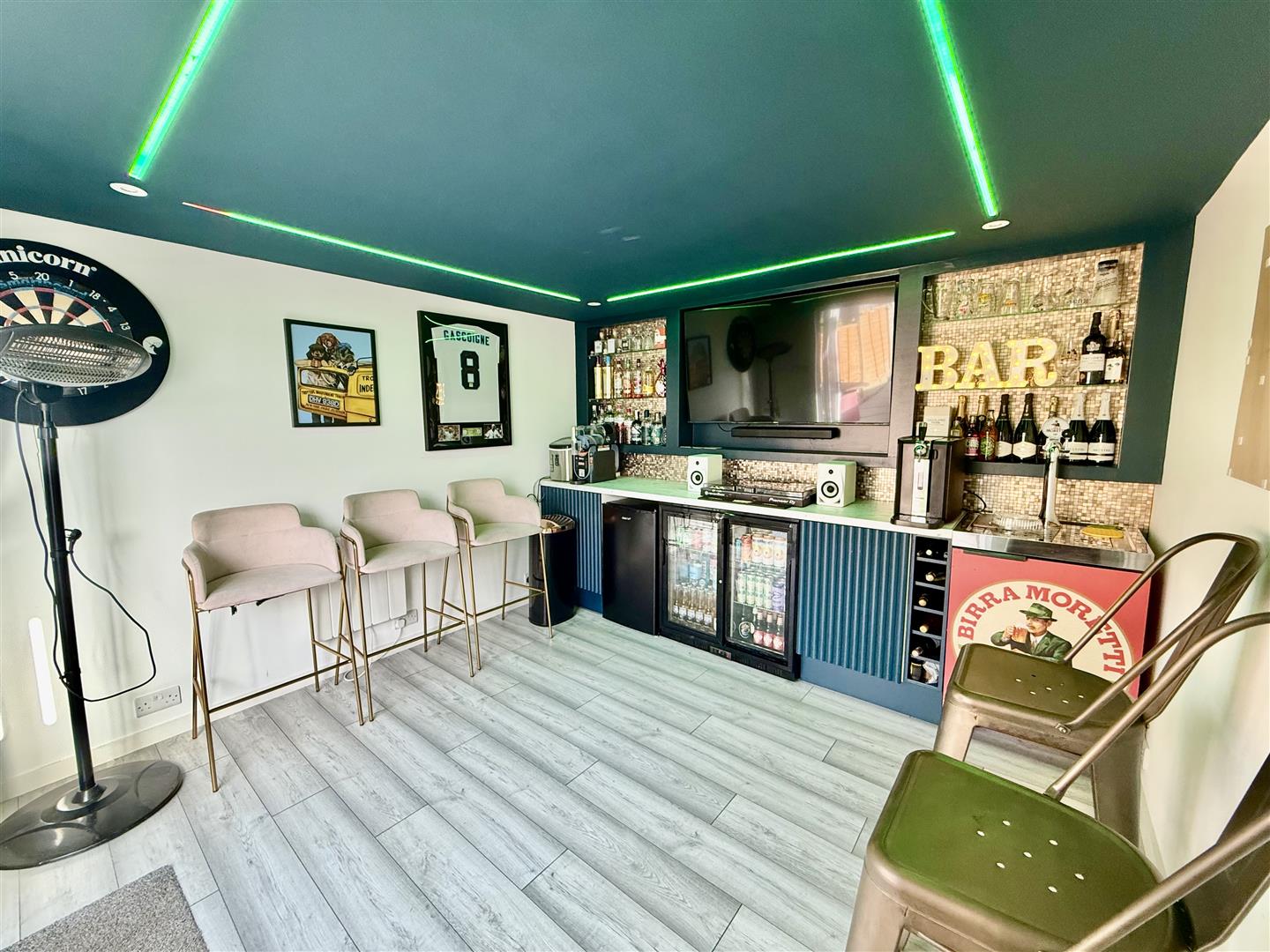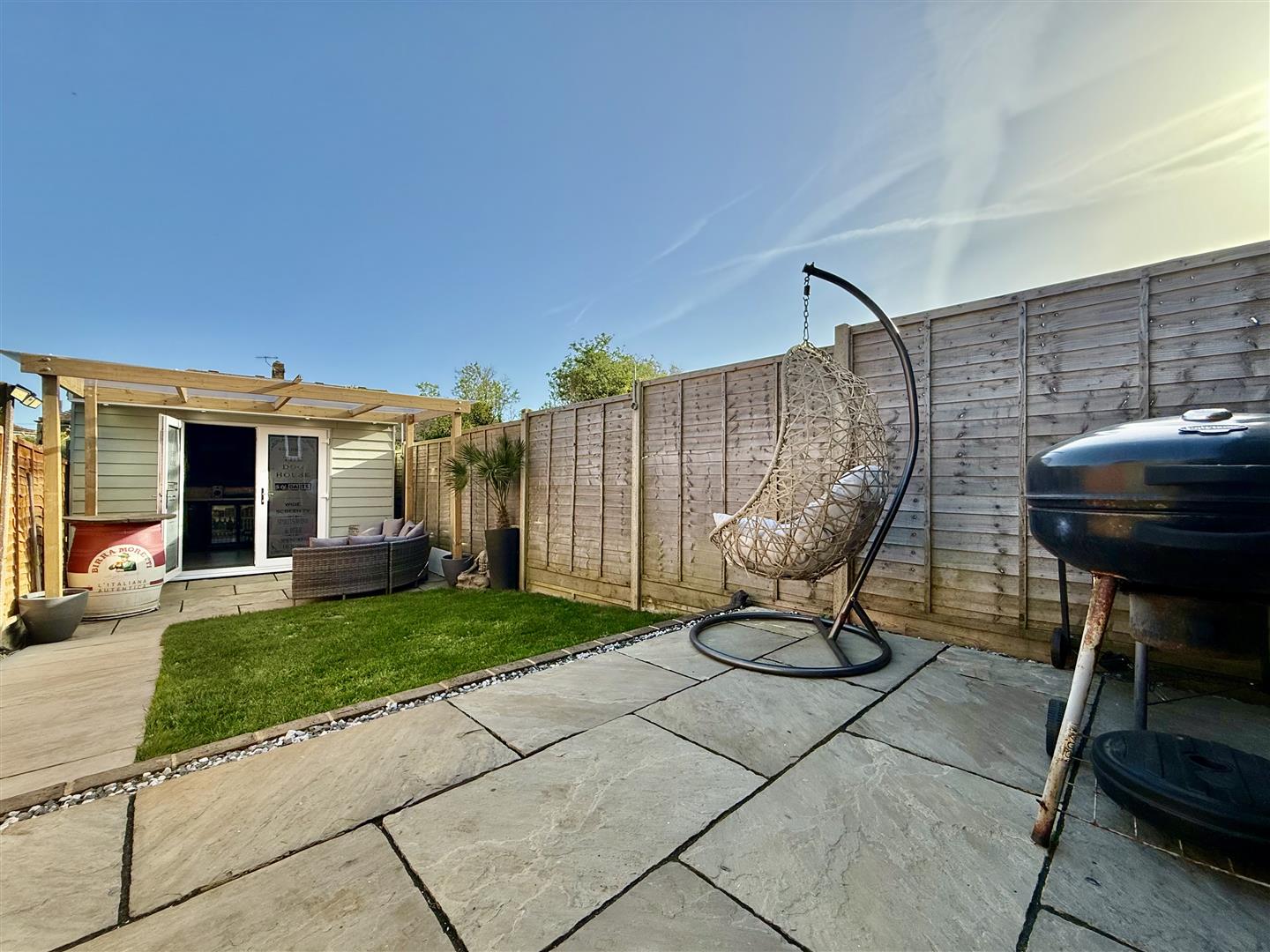Outside, the garden truly steals the show! The predominantly south-facing garden is mostly laid to lawn, featuring a top paved BBQ area and a further undercover socializing space leading to the garden room. Aptly named the "Dog House", it currently serves as a bar and games room, making it ideal for entertaining guests, but it could also be converted into a work-from-home space if needed.