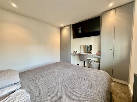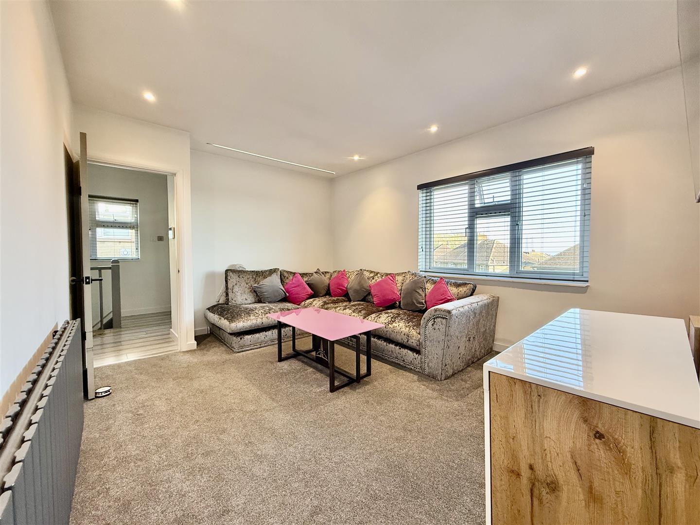 The modern kitchen boasts marble-effect countertops accompanied by high-gloss handle-less storage units, both high and low. A bright splashback enhances the contemporary ambiance. The spacious double bedroom comfortably accommodates a Super King-size bed and features built-in wardrobe space. The lounge continues the modern theme and offers a distant southerly view toward the sea.
