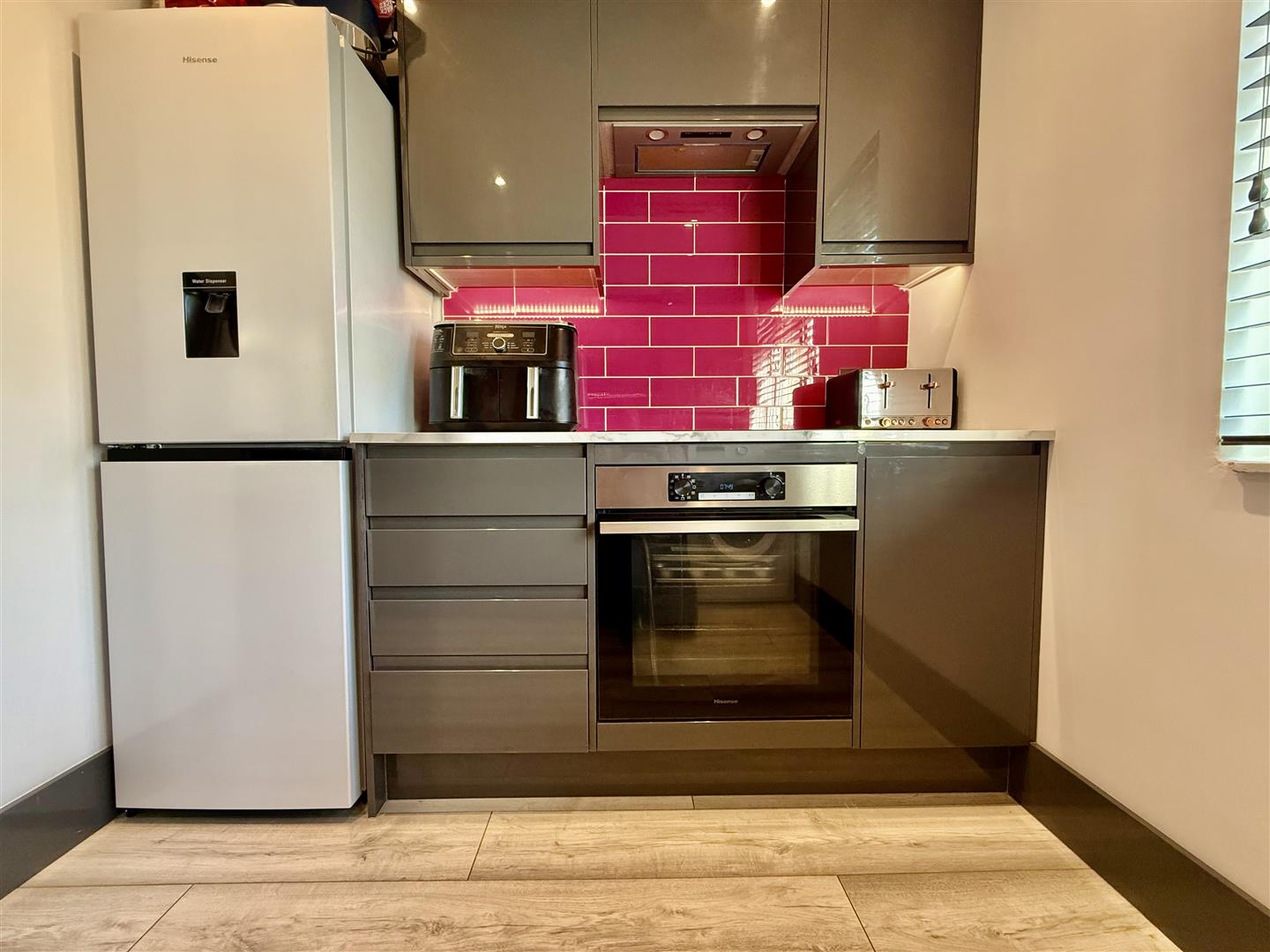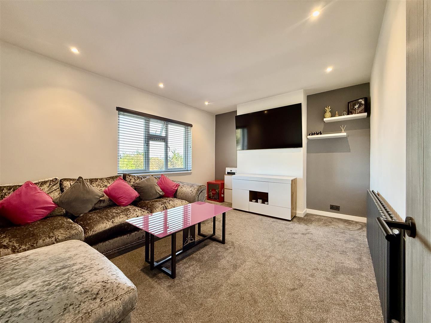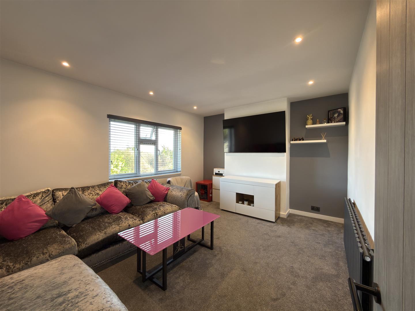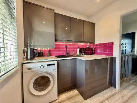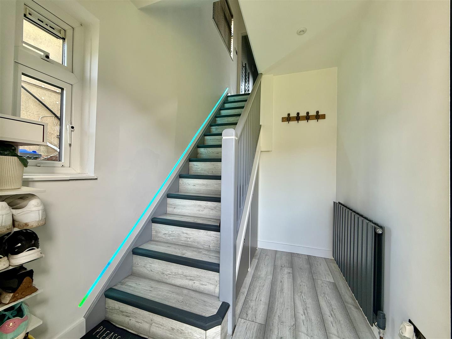 Accessed via a few steps to the private front door, which has been upgraded to a new composite grey design with chrome fittings, the entrance offers ample under-stairs storage, along with additional space for shoes and coats. Inset LEDs illuminate the stairway, giving it a contemporary feel and setting the tone for the rest of the property.