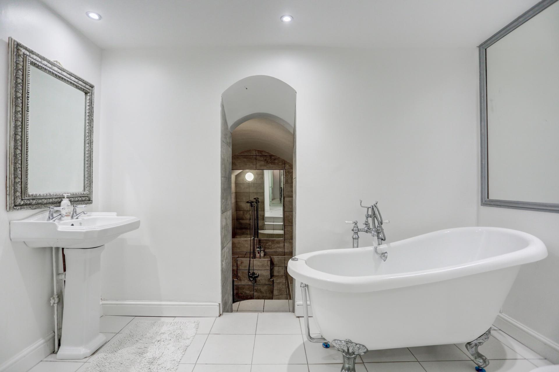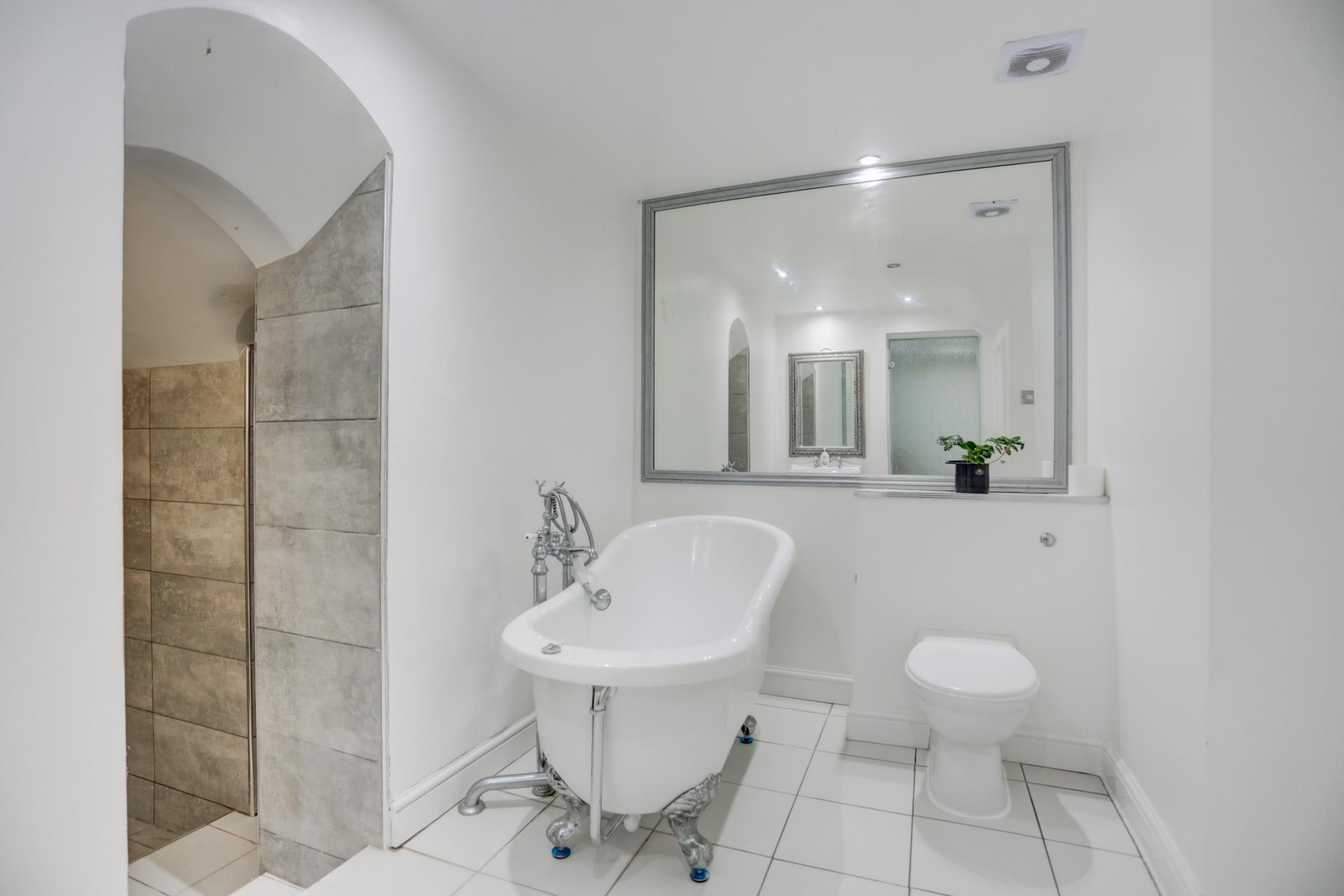 This apartment is well-presented throughout and briefly comprises a spacious split-level lounge and dining room and a separate fitted kitchen with fitted breakfast bar. The large double bedroom has direct access to a Jack-and-Jill style en-suite bathroom complete with freestanding roll-top bathtub and a striking deep set bath/walk-in shower room. There is a further separate w/c and an additional versatile room, which could easily accommodate a dressing room/home office, home cinema or utility area. French doors lead from the reception room out onto an easy-to-maintain south facing patio garden.