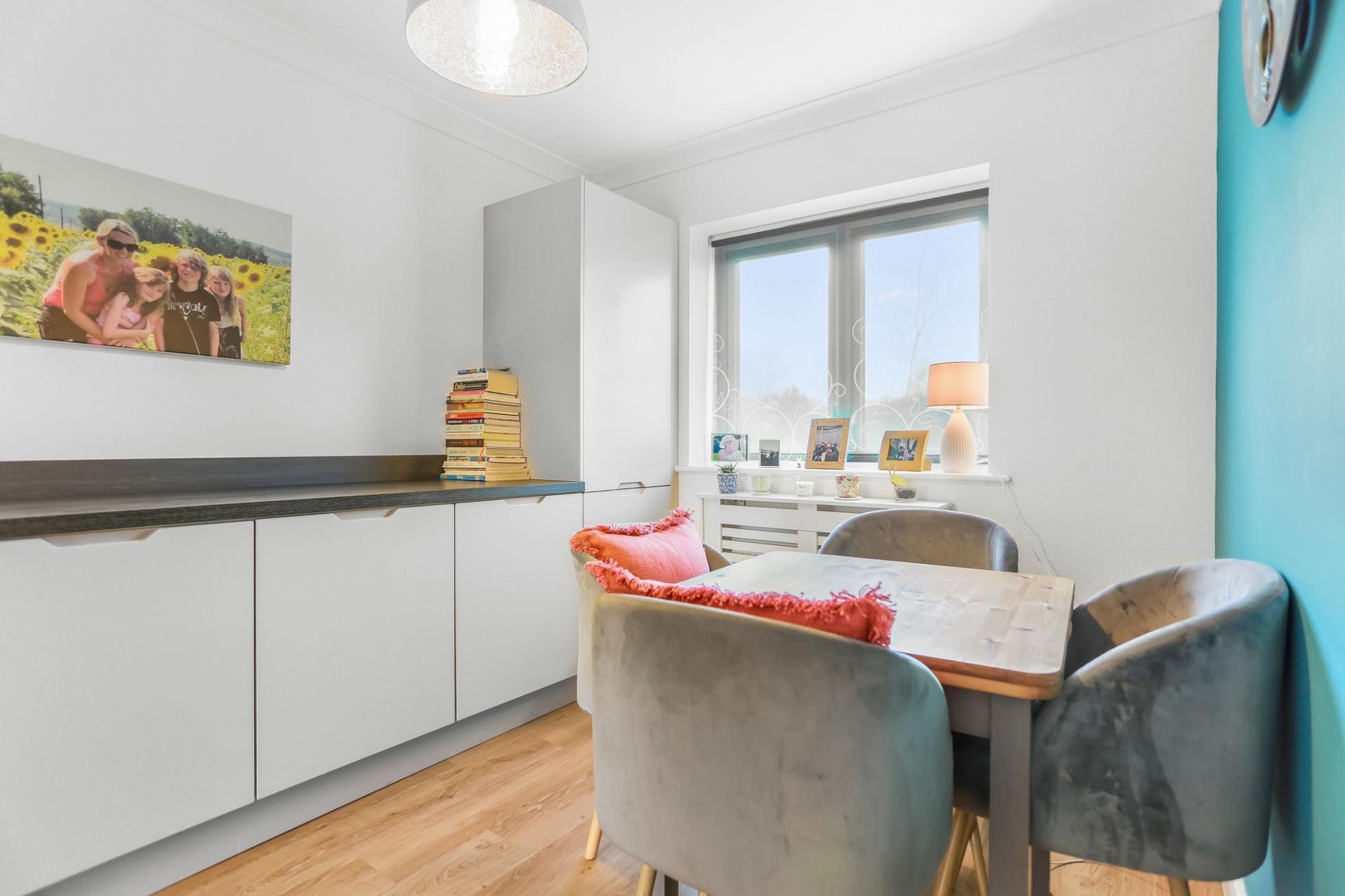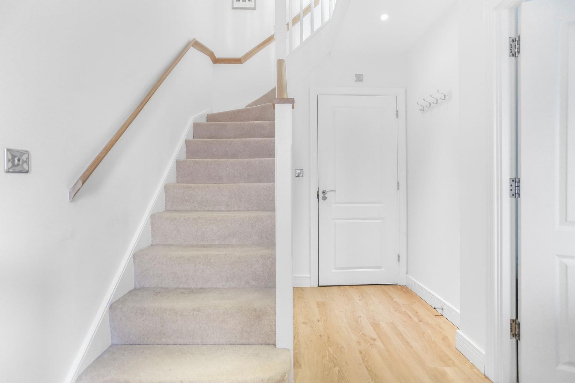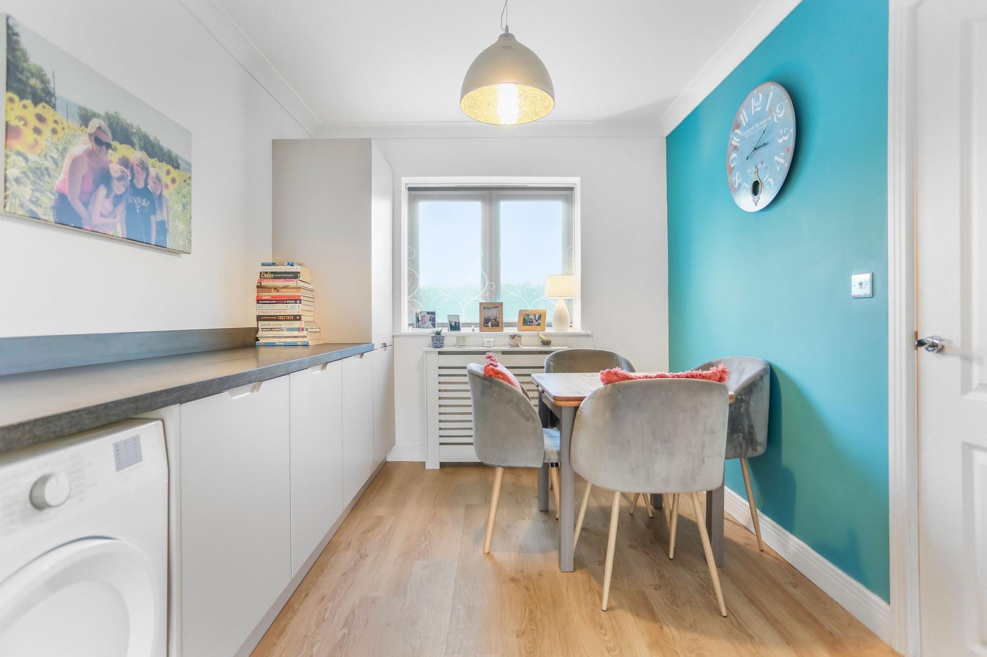 The ground floor welcomes you with a spacious entrance hall and a useful cloakroom, leading through to an impressive open plan living space. The luxury fitted kitchen features newly installed latte coloured cupboards, integrated appliances, new downstairs flooring, and flows seamlessly into the main living and dining area. Bi fold doors open directly onto the landscaped rear garden, creating a superb space for both everyday living and entertaining.