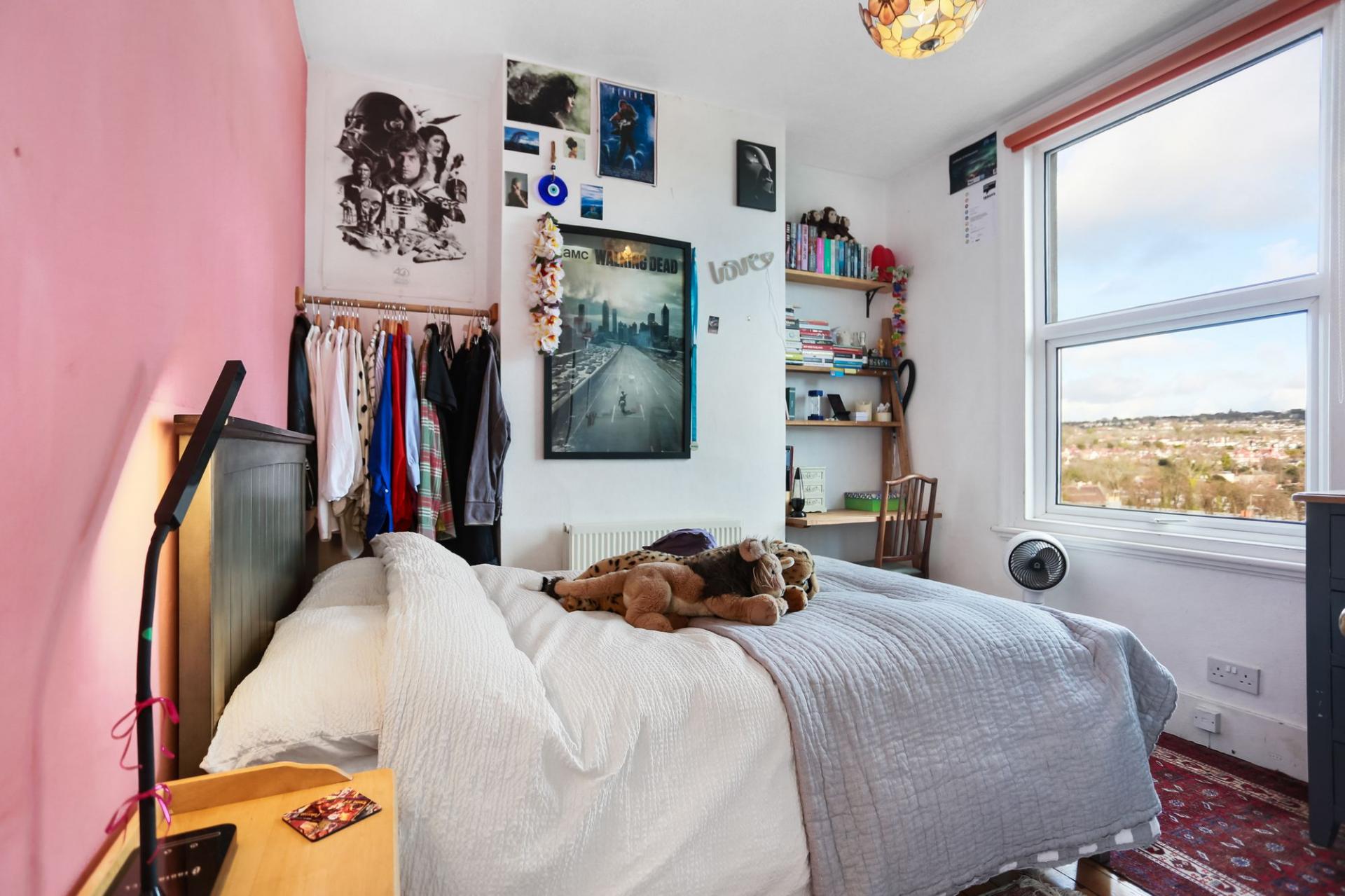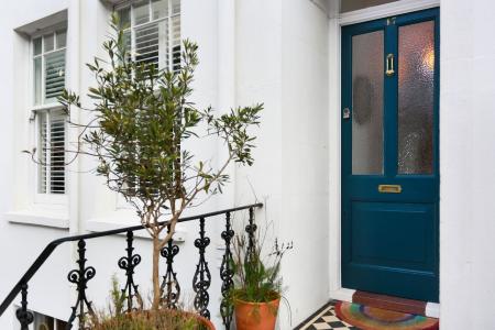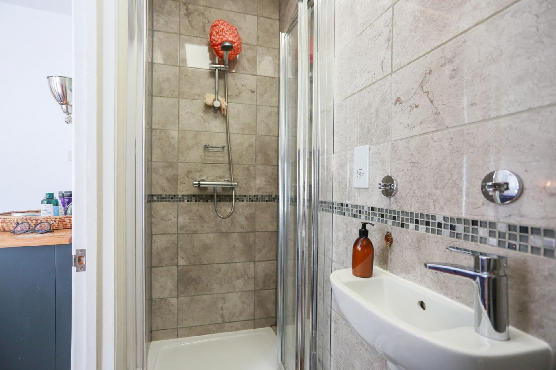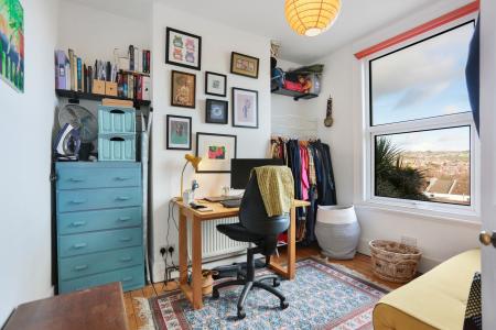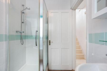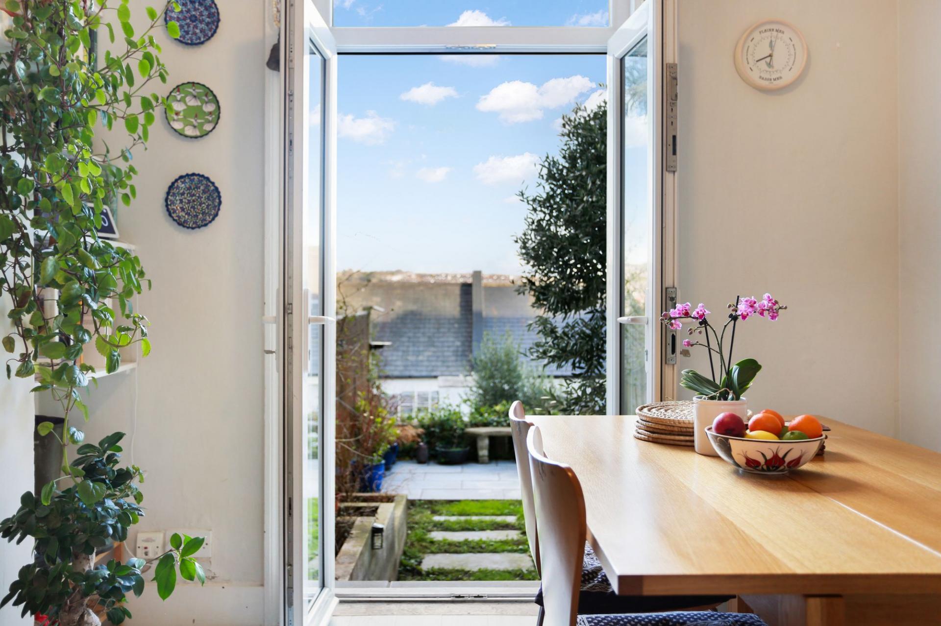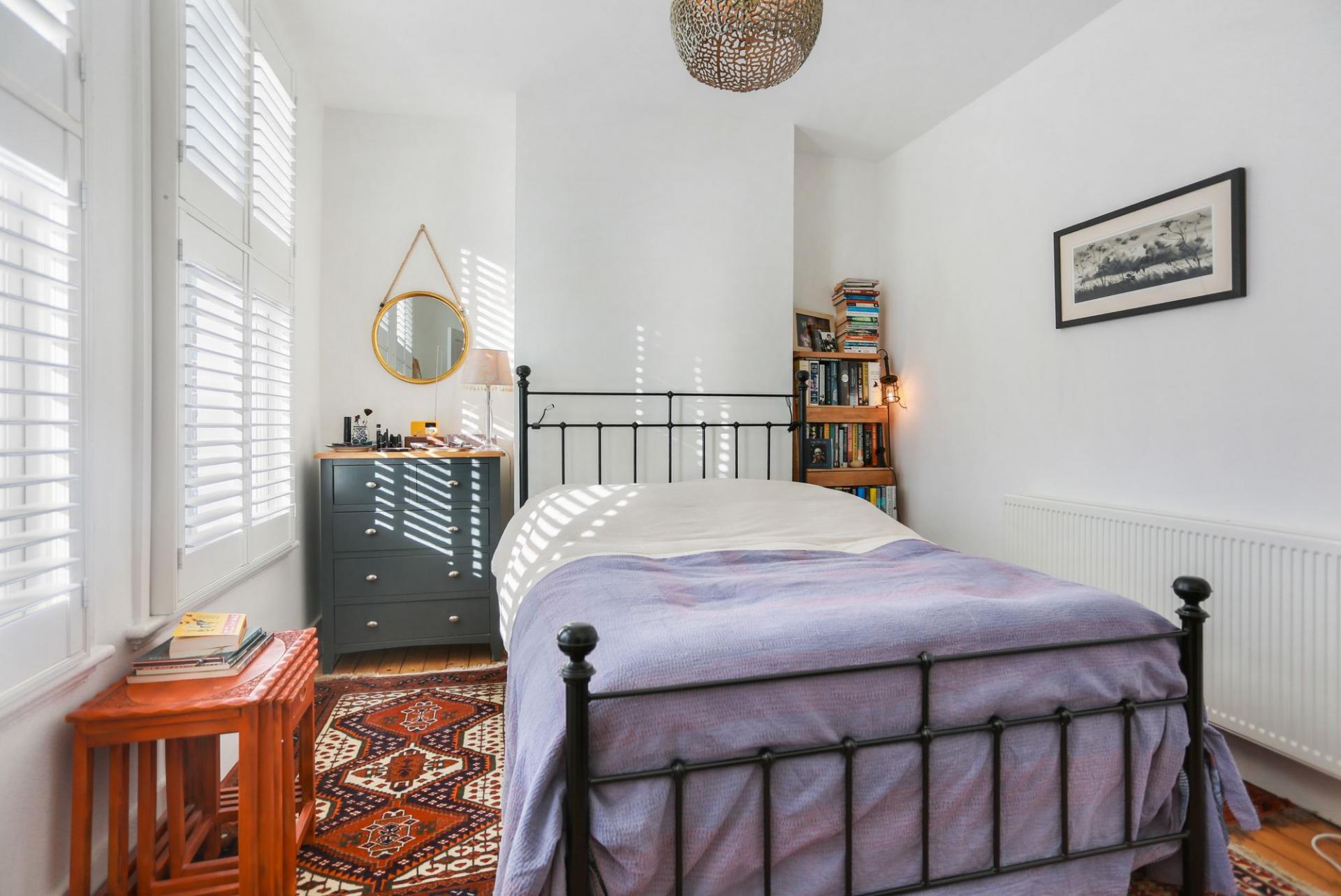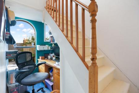 The lower ground floor hosts a modern kitchen-diner with direct garden access, a contemporary bathroom with shower, and a separate W/C. A cleverly designed study nook tucked beneath the stairs features a large oval window that provides lovely garden views and natural light. The ground floor includes a stylish living room with plantation shutters and a versatile double bedroom that could equally serve as a home office or playroom. The first floor comprises two further well-proportioned double bedrooms, including a principal bedroom with a private en-suite bathroom.