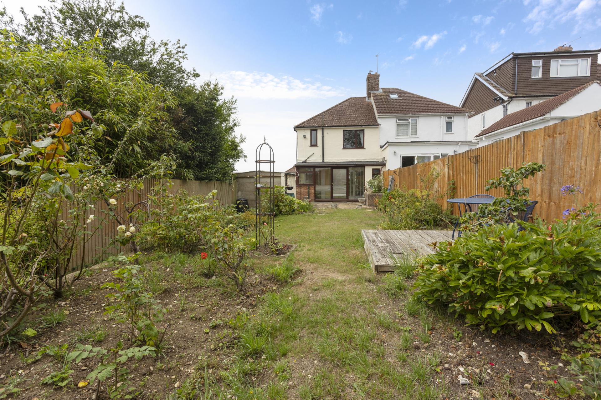 The property boasts a beautifully well-established rear garden sizable rear garden that features a mature lawn and a terrace. There is a separate garage and driveway.