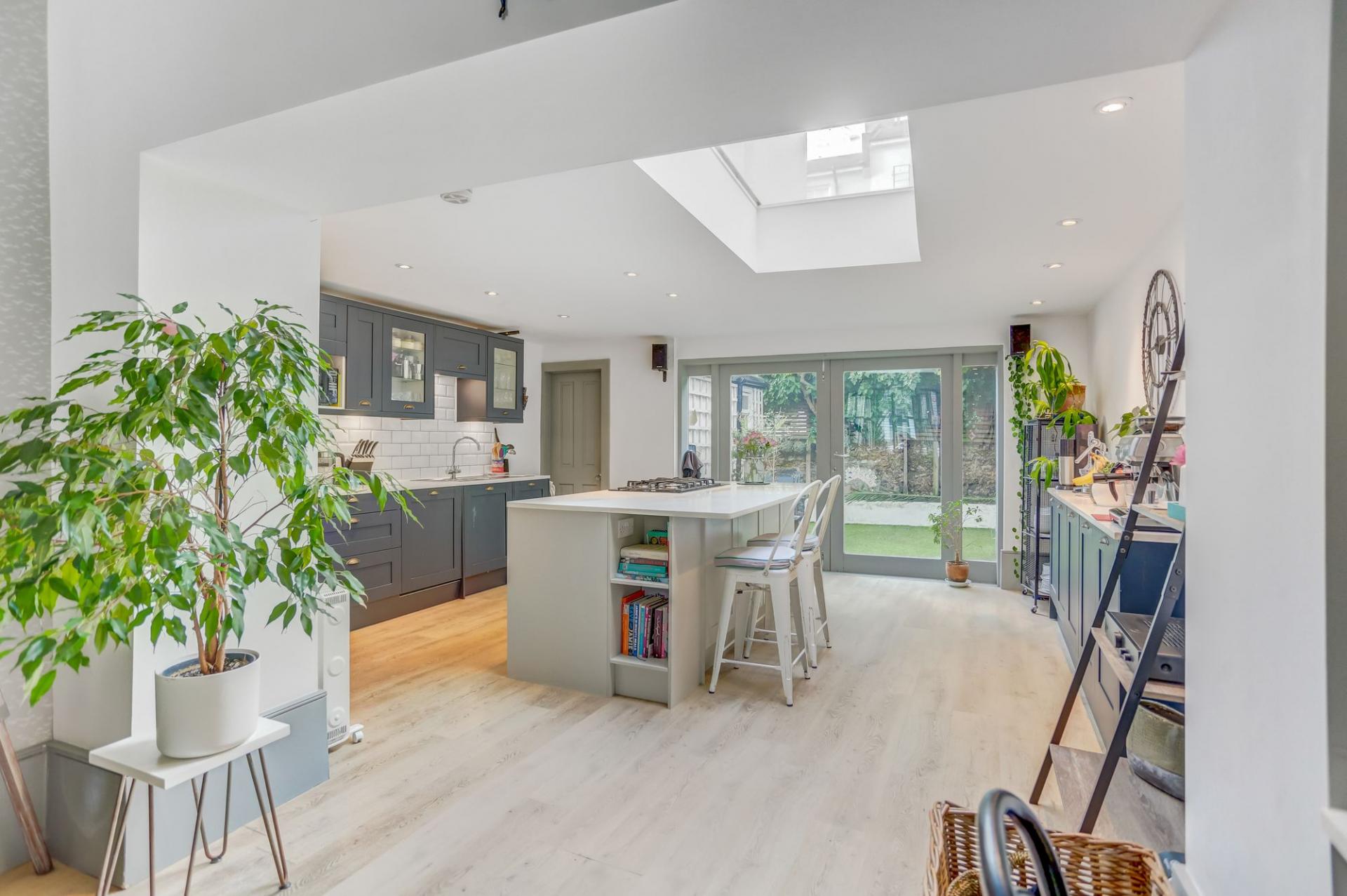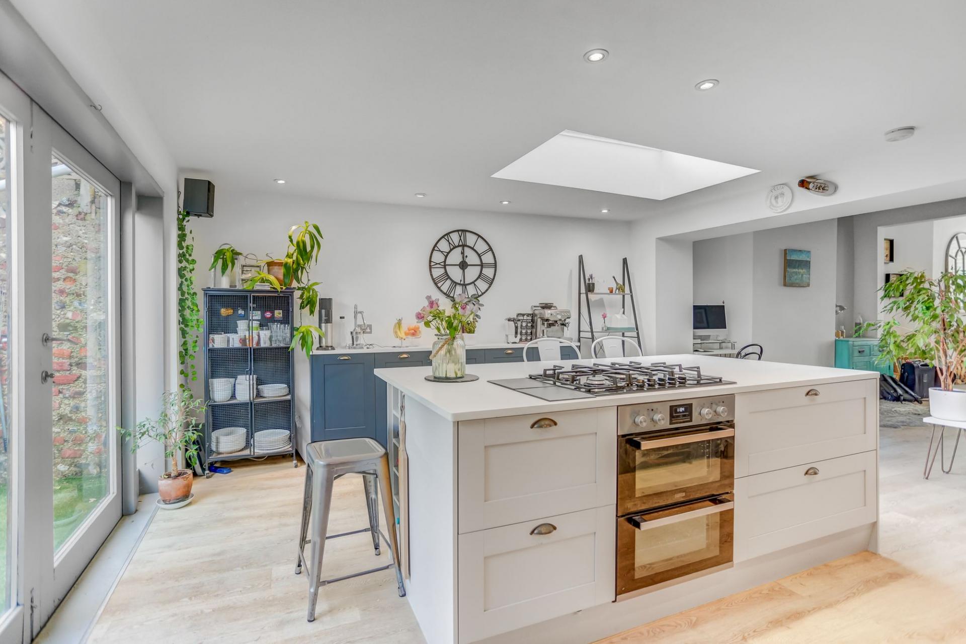 The ground floor is a real highlight, centred around an impressive open plan living area and kitchen that works perfectly for both everyday life and entertaining. The layout flows beautifully, with doors opening directly onto a delightful west facing garden, an ideal spot for afternoon sun, al fresco dining and relaxed evenings with friends. The versatile arrangement continues across the upper floors, offering five double bedrooms in total, one of which is currently used as an additional lounge area, perfect as a snug, home cinema room, playroom or work from home space depending on your needs. Completing the accommodation are two well sized bathrooms, both well placed to serve family life and visiting guests with ease.