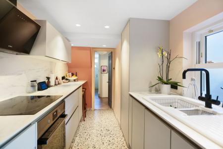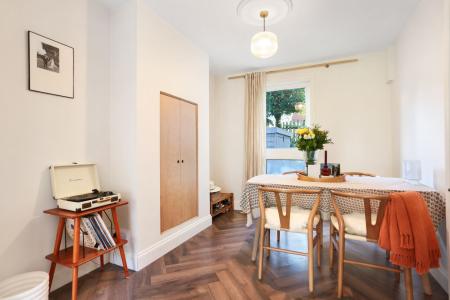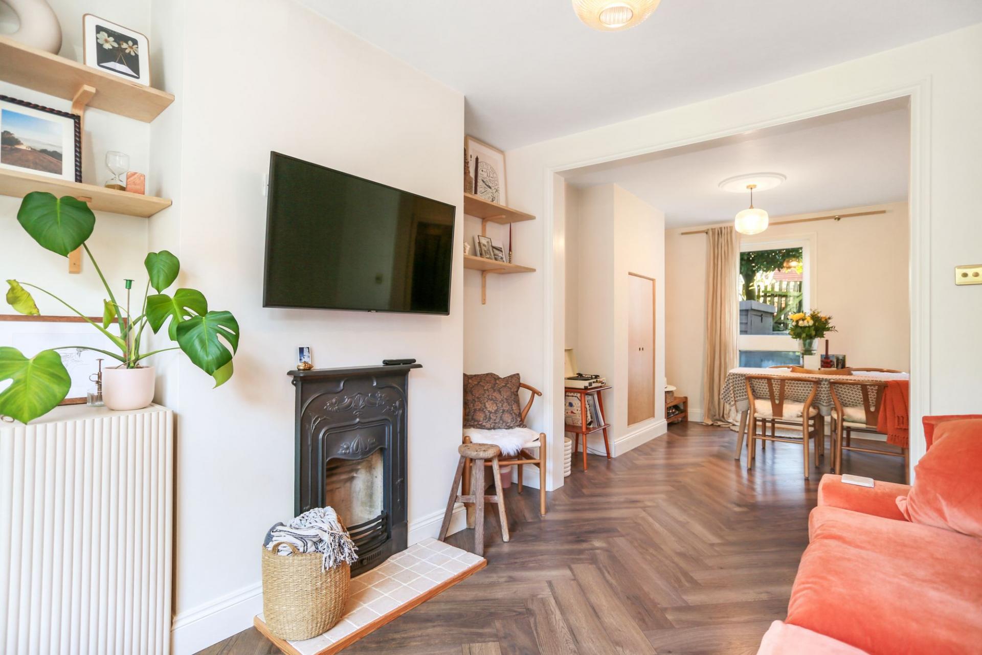 To the front, a welcoming double reception room is filled with natural light from a large bay window and features herringbone flooring and an attractive period fireplace. Set neatly behind, the separate modern kitchen provides sleek handleless cabinetry, excellent worktop space and a range of built-in appliances, finished with tasteful pops of colour.