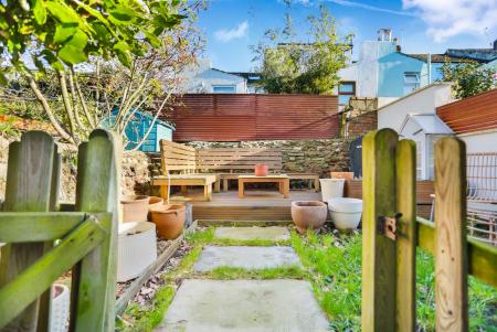 From the living/dining room, doors open directly out to the rear garden, where steps lead up to a raised terrace, an ideal spot for relaxing, dining and entertaining.