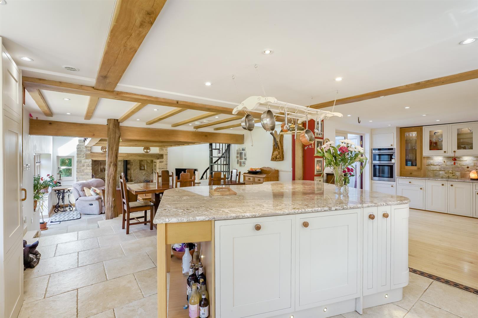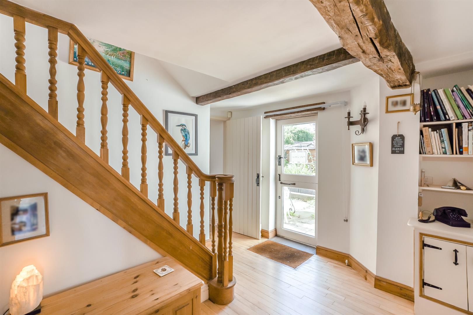 - Entrance hall with exposed stone walls, wooden floors, and rustic beams