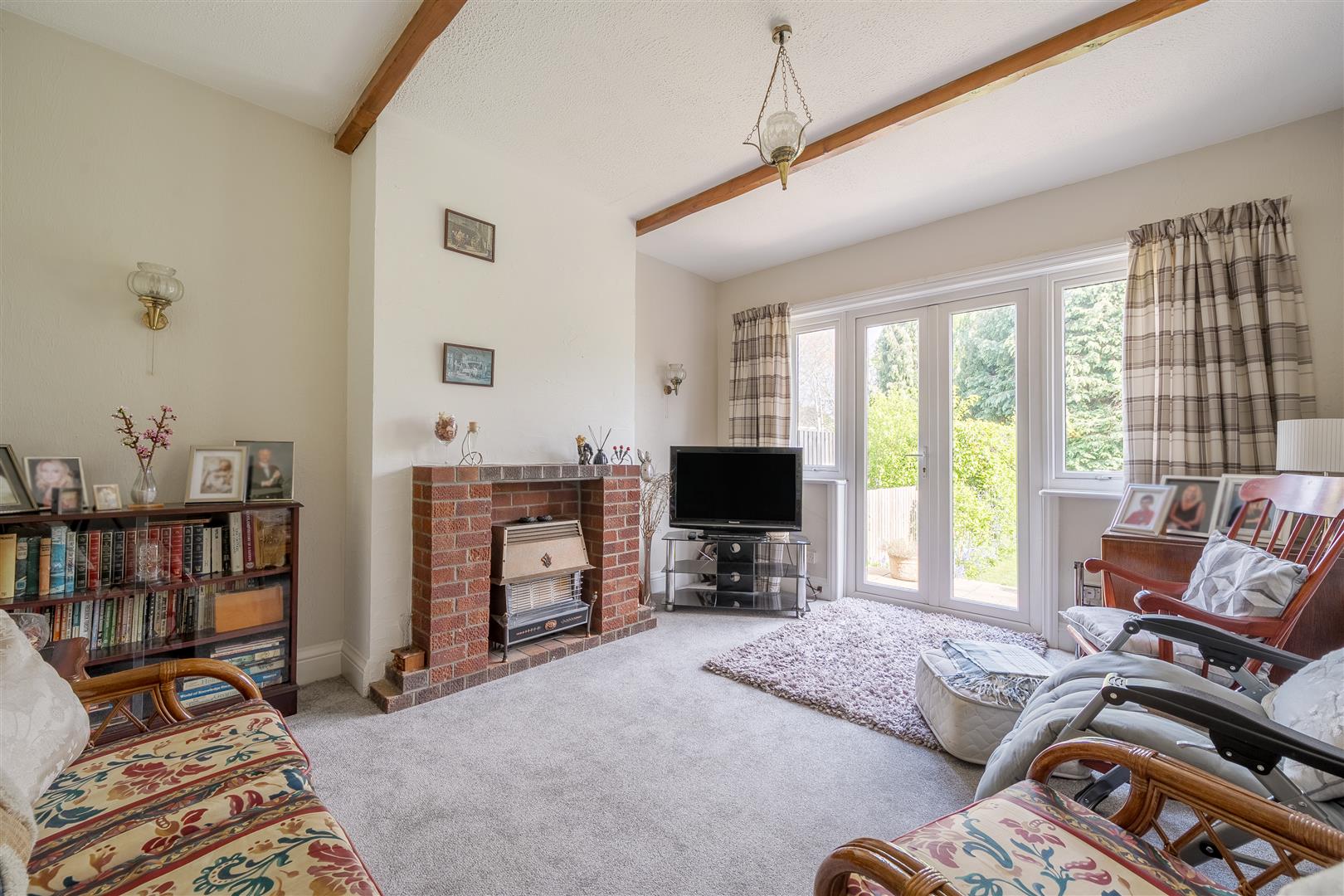 Reception Two - 4.5m x 3.6m (14'9" x 11'9") - Dual double glazed windows and double glazed French doors to rear aspect overlooking and providing access to rear garden, feature gas fireplace with brick surround, radiator, power points.