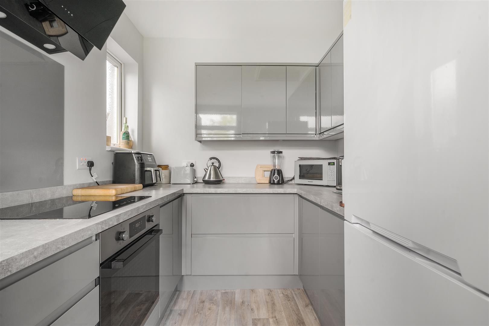 Kitchen - 3.5m x 2.5m (11'5" x 8'2" ) - Dual aspect double glazed windows to rear and side aspects, obscured double glazed door to rear aspect leading to rear garden. Modern kitchen comprising range of matching wall and base units with roll top work surfaces, bowl and a quarter stainless steel sink with mixer tap over, integrated electric oven, four ring electric hob with extractor fan over, space and plumbing for washing machine, space and power for upright fridge/freezer, power points, splashbacks to all wet areas.