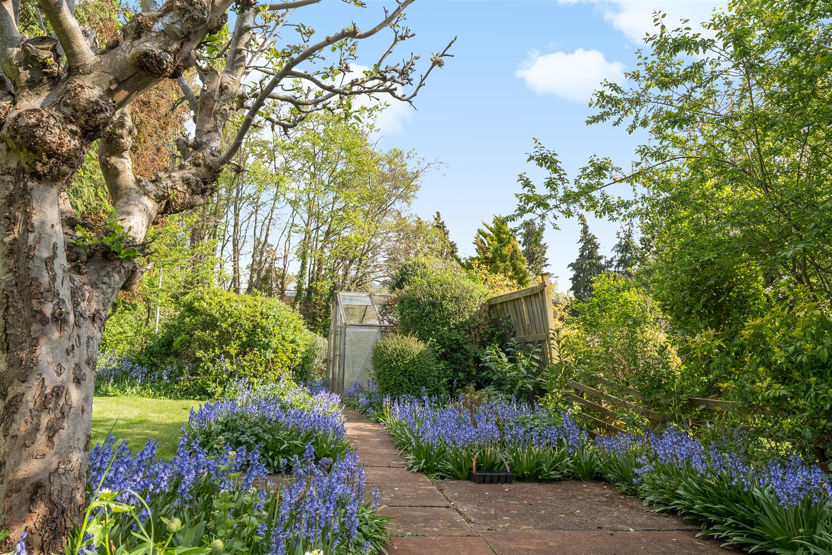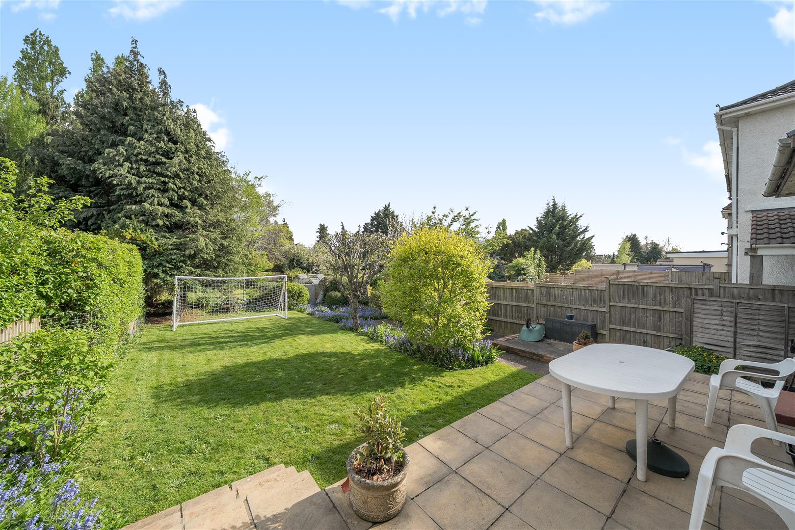 Externally, the home is set within substantial gardens. The front boasts a level lawn, a large stone-chipped driveway with turning space, and access to a single garage. The rear garden stretches to approximately 175ft (53m) and is predominantly laid to lawn, enhanced by a raised patio, well stocked flower beds, and a variety of mature trees.