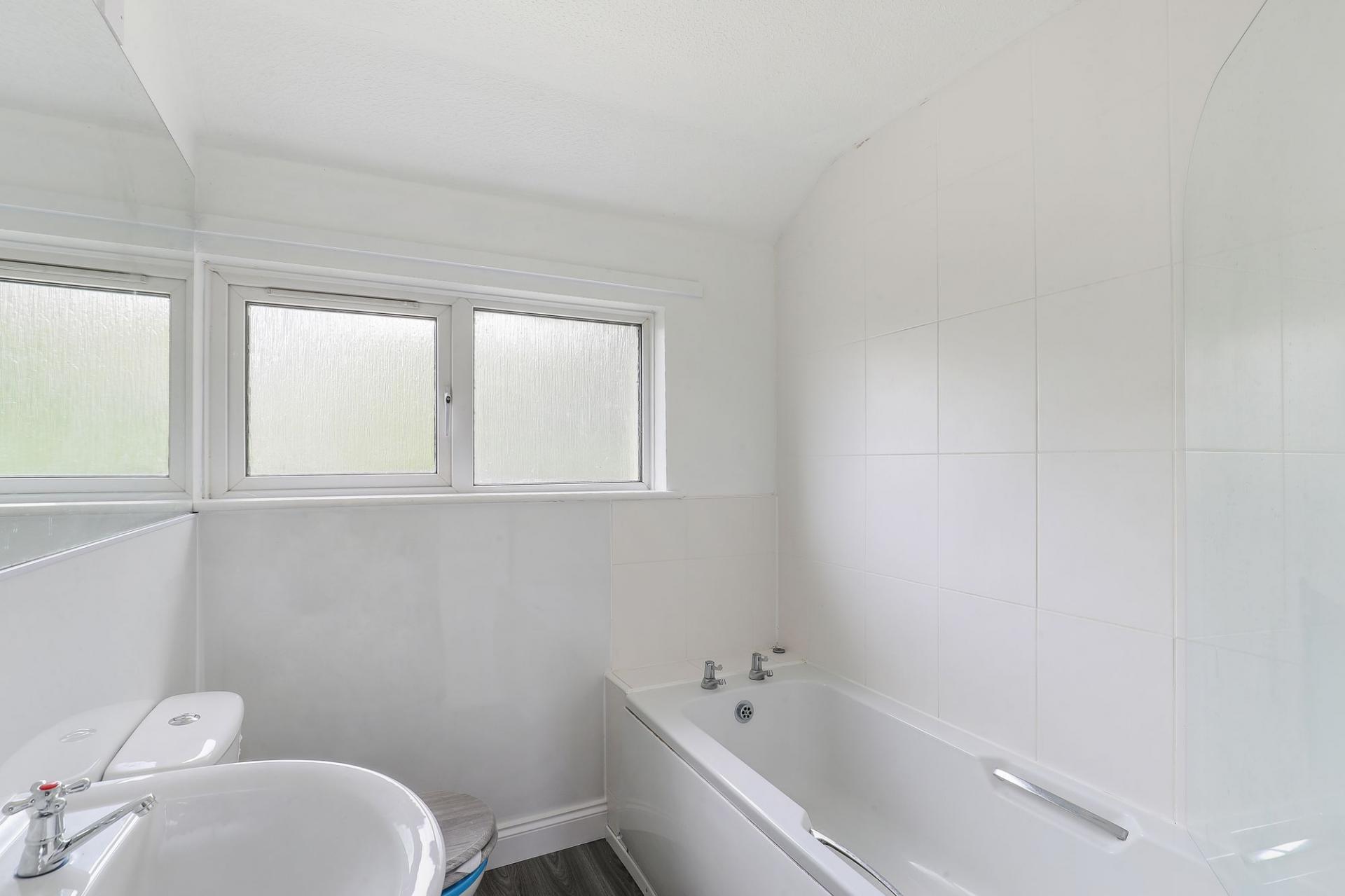 The property boasts three generously sized bedrooms and a recently fitted white bathroom suite, creating a fresh and contemporary feel. A spacious kitchen provides plenty of storage with a wide array of cupboards, while the well-proportioned living room, located at the rear of the home, offers a comfortable and private space to relax and unwind.