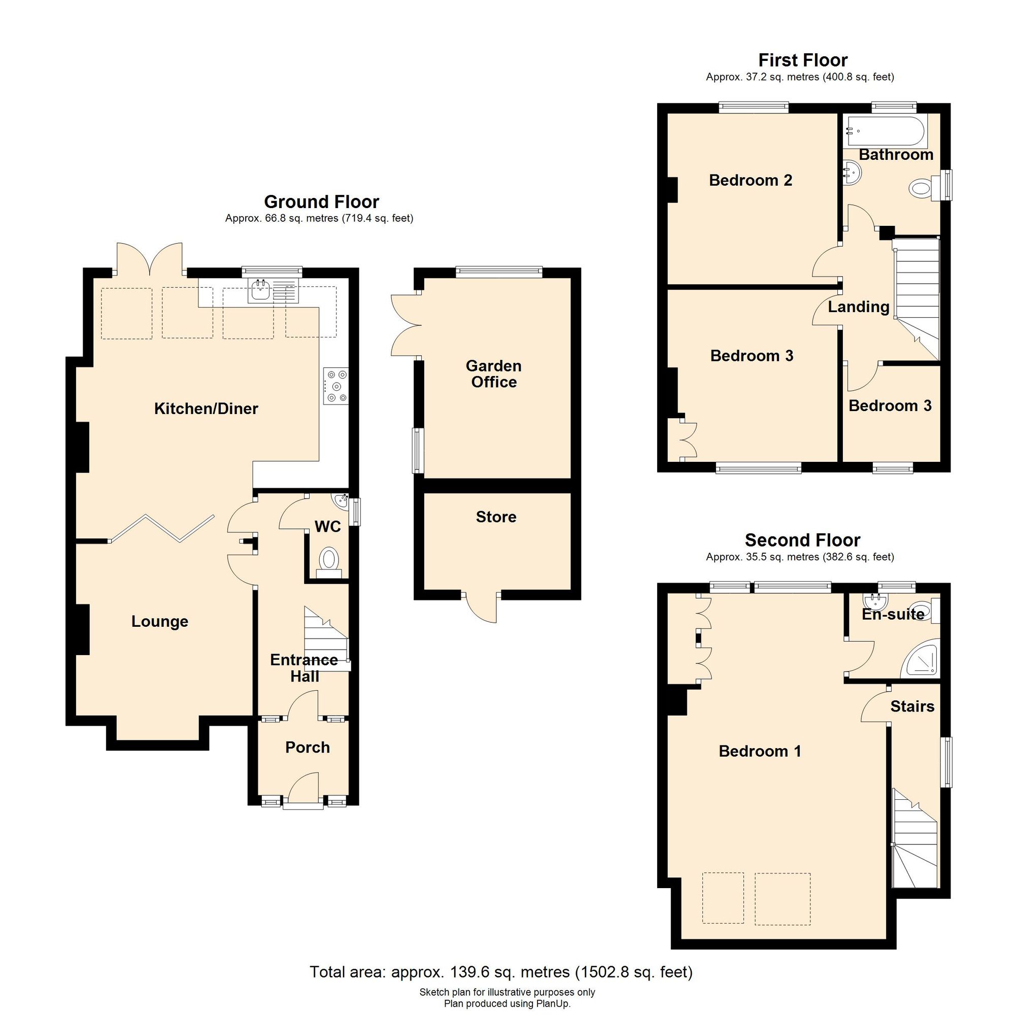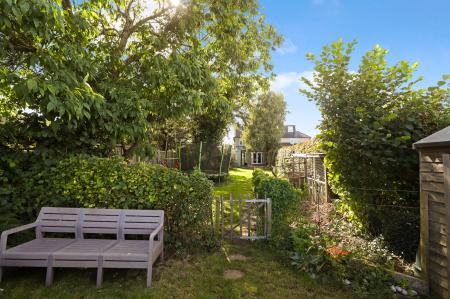 The garden is a true delight, with a patio directly off the kitchen, a well-maintained lawn, and beautiful borders, hedges, and trees. The current owners have also created two additional sections: a chicken coop and a relaxing chill-out area. The garden office, complete with electricity, offers an ideal workspace with lovely garden views, plus additional storage for bikes, camping gear, or other uses.