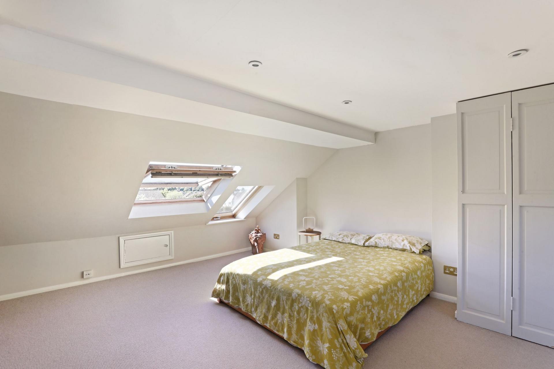 Stairs from this landing lead to the principal bedroom on the second floor, a spacious and bright room with stunning views, built-in storage, and an en-suite shower room.