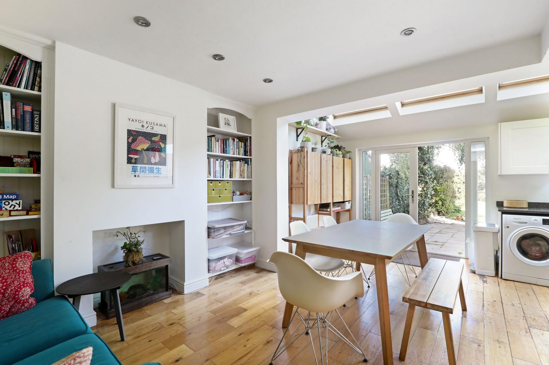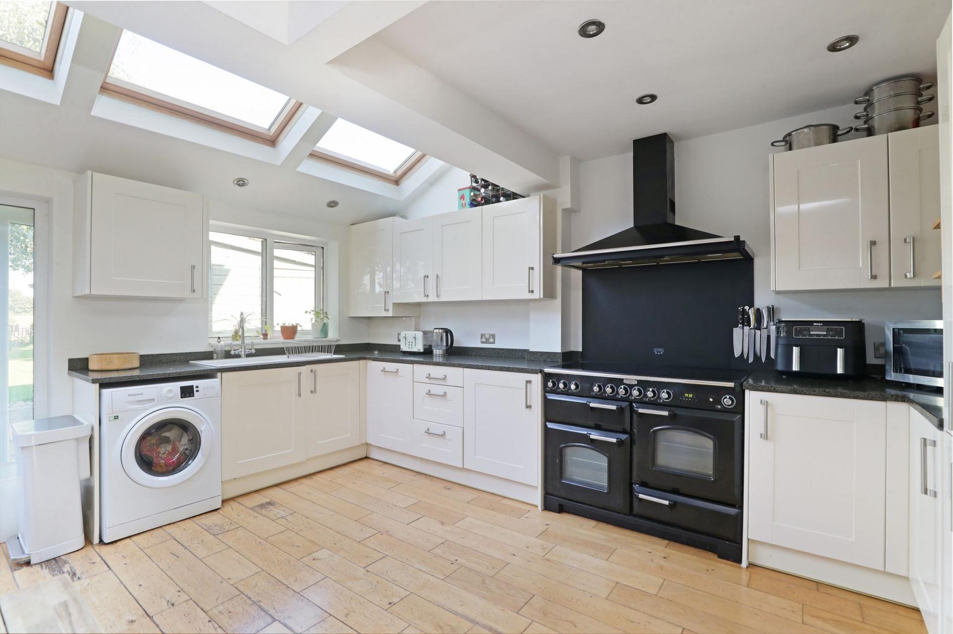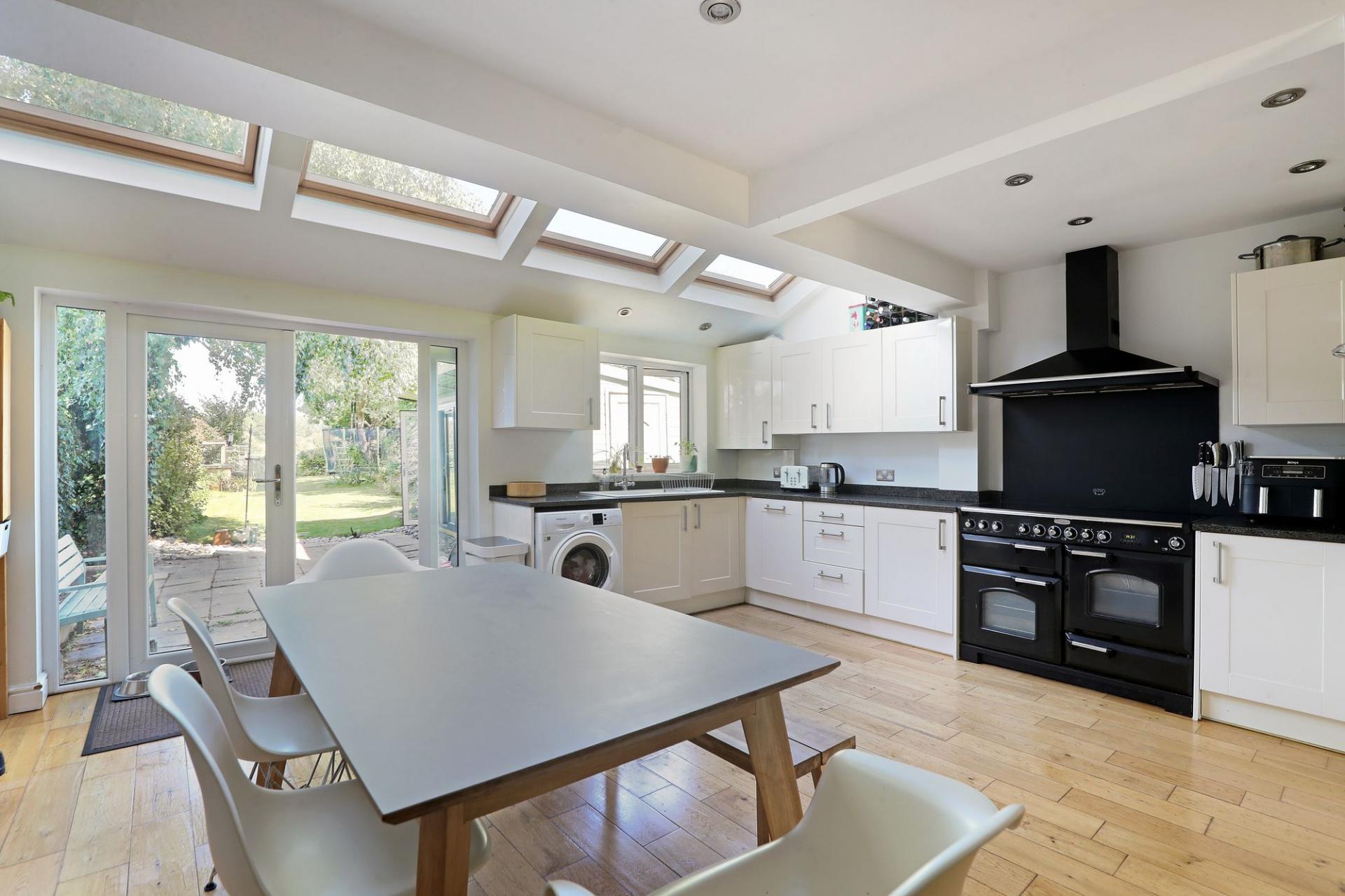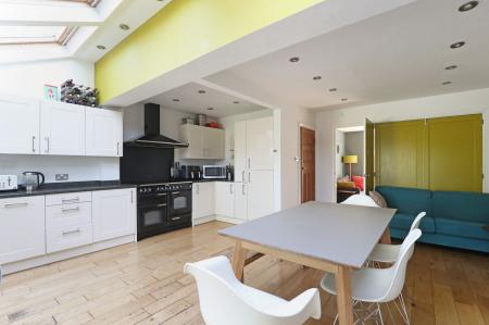 This vibrant and beautifully extended 4-bedroom semi-detached home offers everything a modern family could desire. The spacious open-plan kitchen is flooded with natural light from multiple Velux windows and French doors that open onto the garden. It features sleek white kitchen units, granite countertops, and integrated appliances. The sliding doors provide flexibility to open the space into the lounge for social occasions or close it off to create a cosy snug.