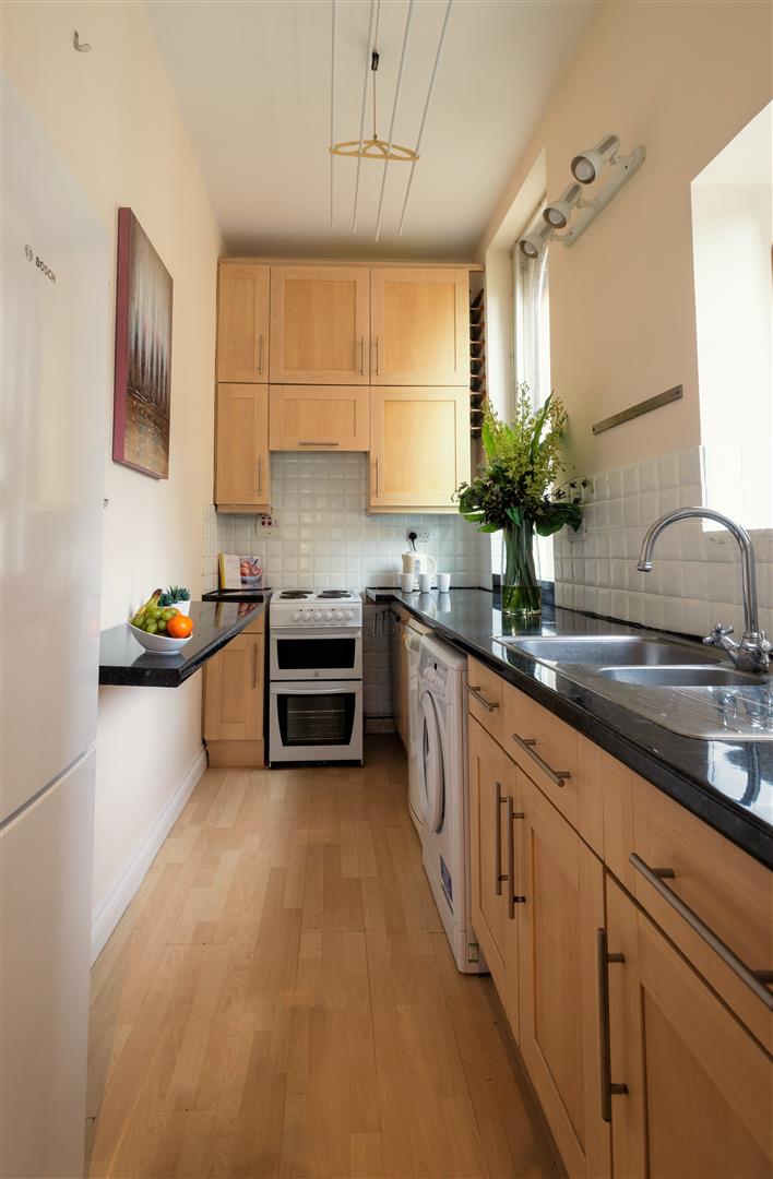 The kitchen is reached from the living room and boasts a range of timber base and wall mounted units finished with black granite effect work surfaces and splash back tiling surround, with space for freestanding appliances. There is a clever foldaway breakfast bar maximising the space.