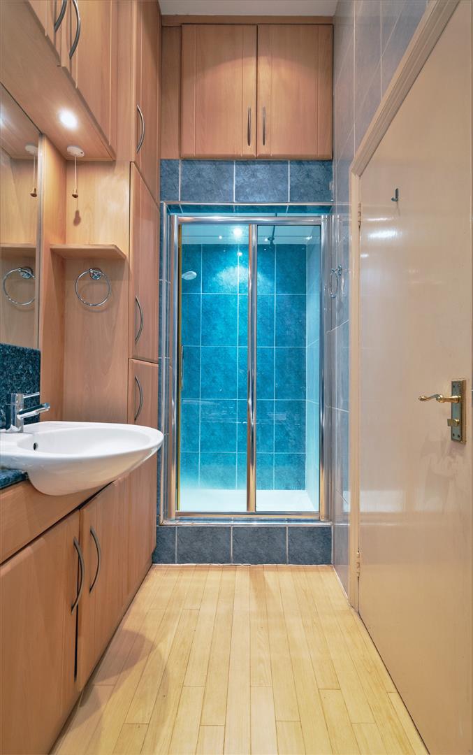 The two bedrooms are accessed from the entrance hall, the main bedroom has an open aspect over the garden to the rear and has a comprehensive range of built in mirrored wardrobes to one wall providing plenty of hanging and storage space. The modern bathroom suite includes a double ended bath with a central chrome mixer tap, as well as a separate shower. A range of oak fronted wall cupboards with ample storage/shelving include a wash hand basin with chrome tap fitting. Built in wall mirror and down lighters.