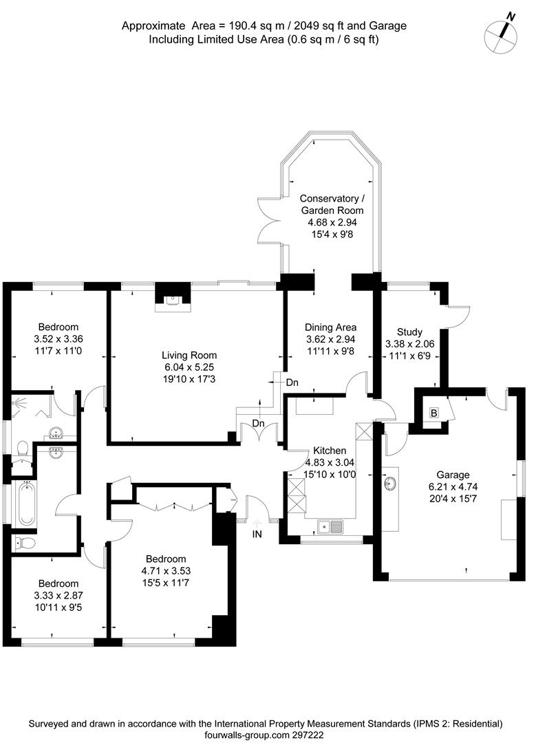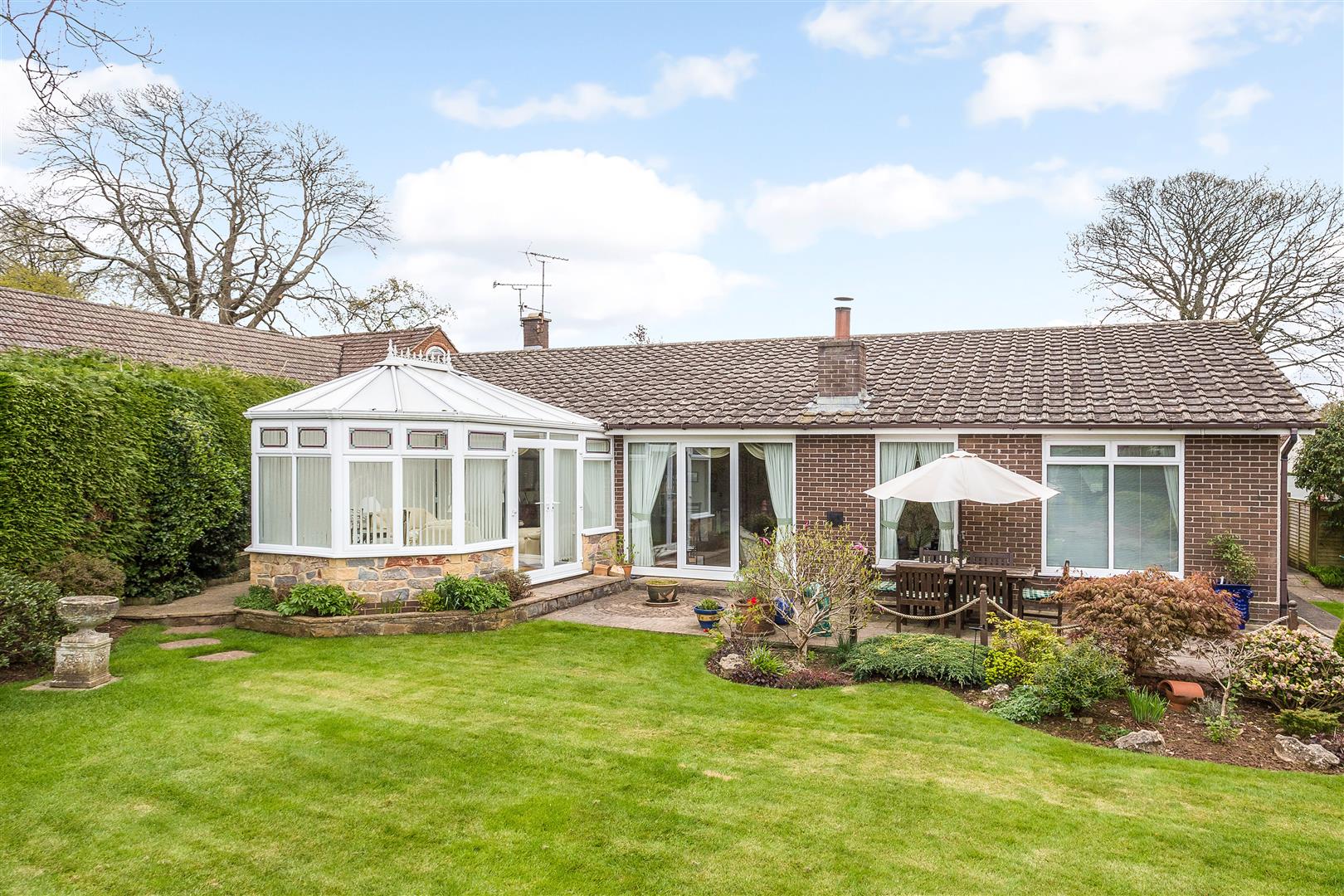 An opening beyond the conservatory provides access to a paved courtyard leading to the garage and study. Gated side paths to either side of the property link the front and rear gardens.
