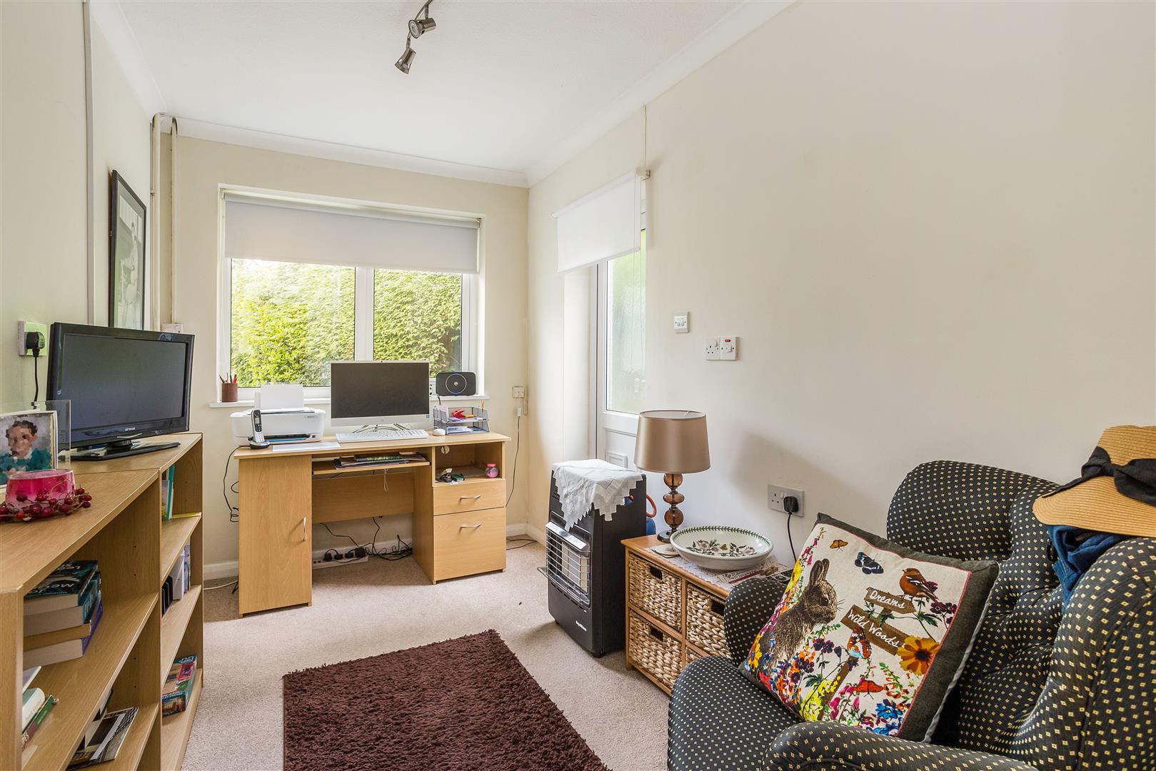 The garage includes a sink unit with hot and cold water, as well as plumbing for a washing machine. Space for a freestanding tumble drier. A door opens onto the rear garden.