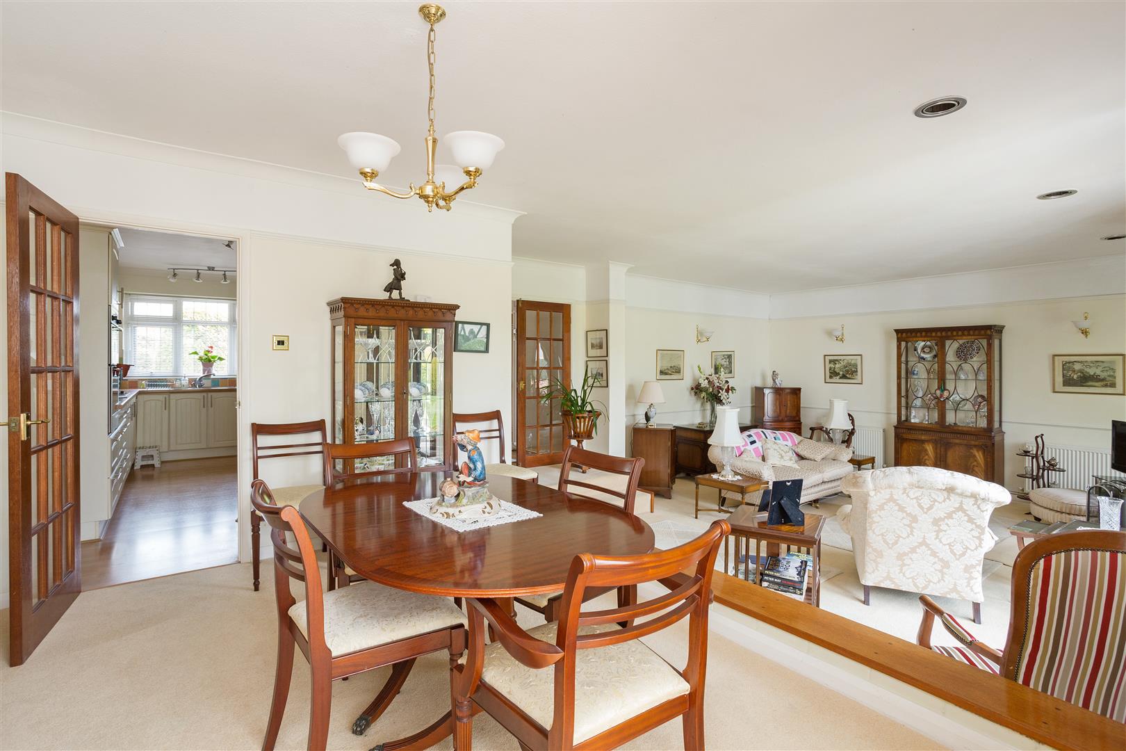 Double doors open off the entrance hall into an impressive open plan, split level sitting/dining room which enjoys an open outlook over the rear garden as well as direct access via full height windows onto the rear patio and garden. The spacious sitting room includes a solid fuel wood burning stove. A raised dining area to one end provides direct access to the kitchen and the conservatory. The fully glazed conservatory enjoys an open outlook over the attractive landscaped garden, with French doors opening directly onto the paved patio, ideal for external dining.