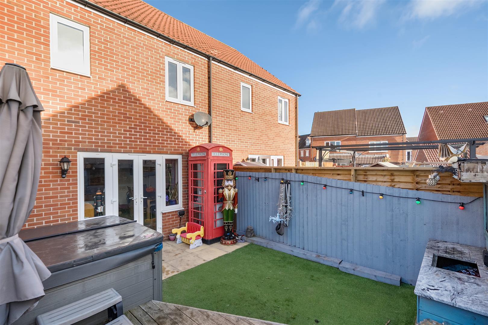 Rear Garden - Low maintenance rear garden mainly laid to artificial lawn that's complimented by a raised deck and separate patio ideal for entertaining. External bar with built in storage, wall and fenced boundaries, gate leading to driveway.