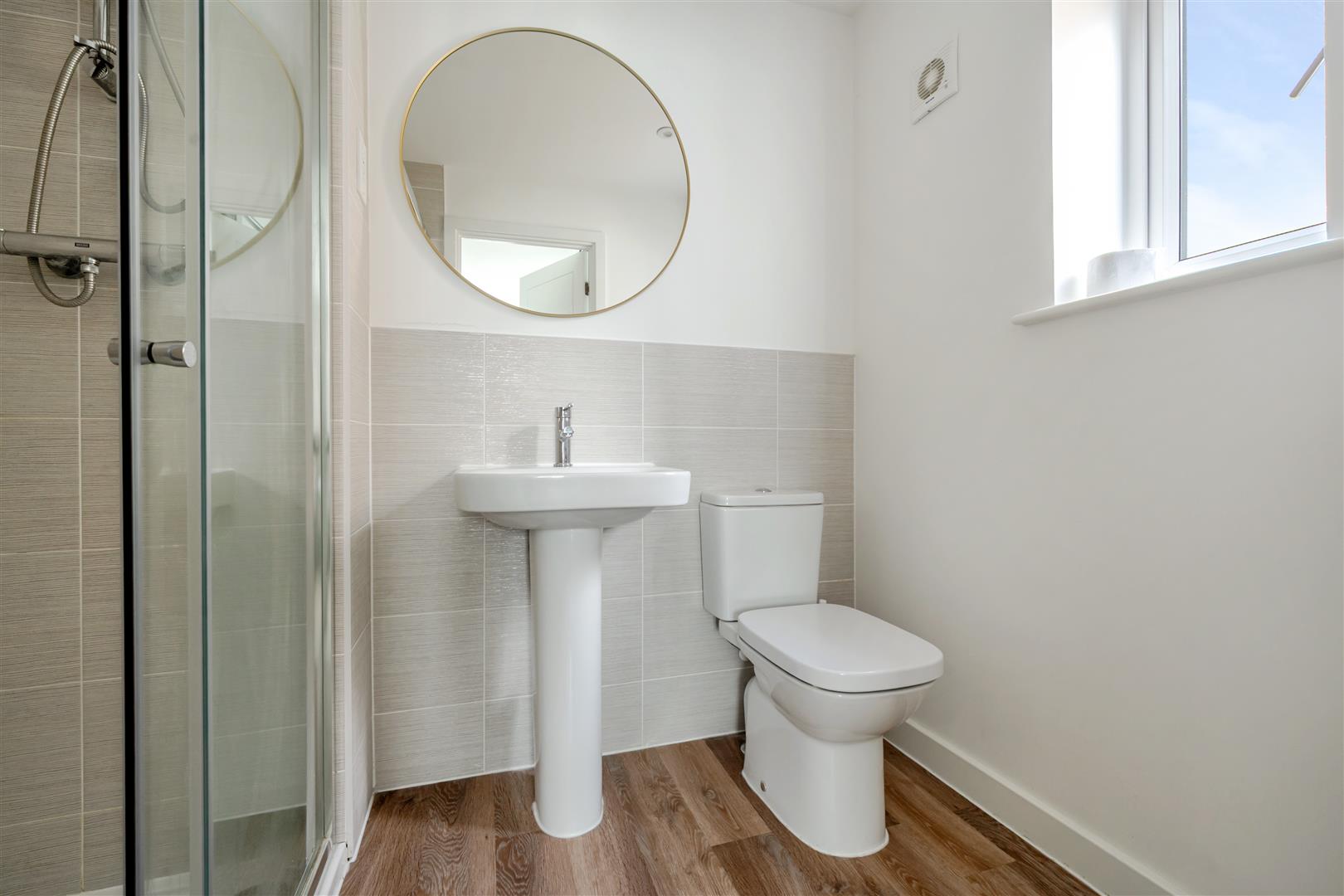 En Suite Shower Room - 2.3m x 1.4m (7'6" x 4'7" ) - Obscured double glazed window to side aspect, modern matching three piece suite comprising pedestal wash hand basin with mixer tap over, low level WC and walk in shower cubicle with shower off mains supply over, heated towel rail, extractor fan, tiled splashbacks to all wet areas.