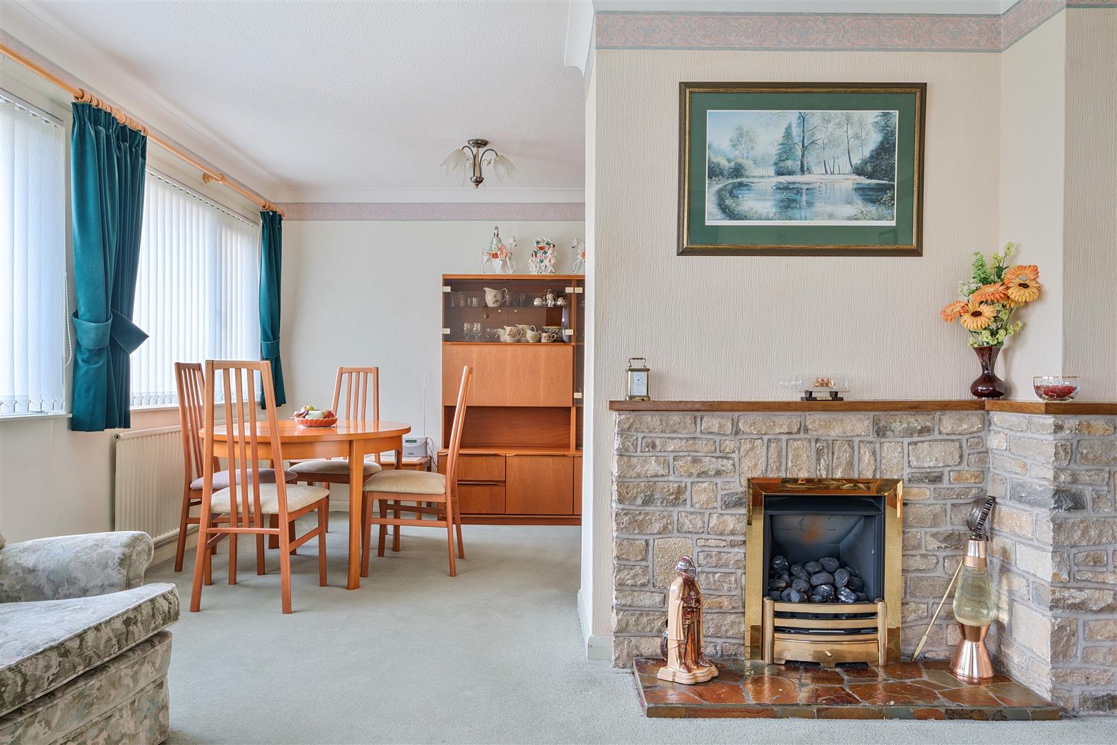 Lounge - 4.8m x 3.9m (15'8" x 12'9" ) - Dual aspect double glazed windows to front and side aspects, feature gas flame effect fire with stone surround, radiator, power points, opening leading to dining room.