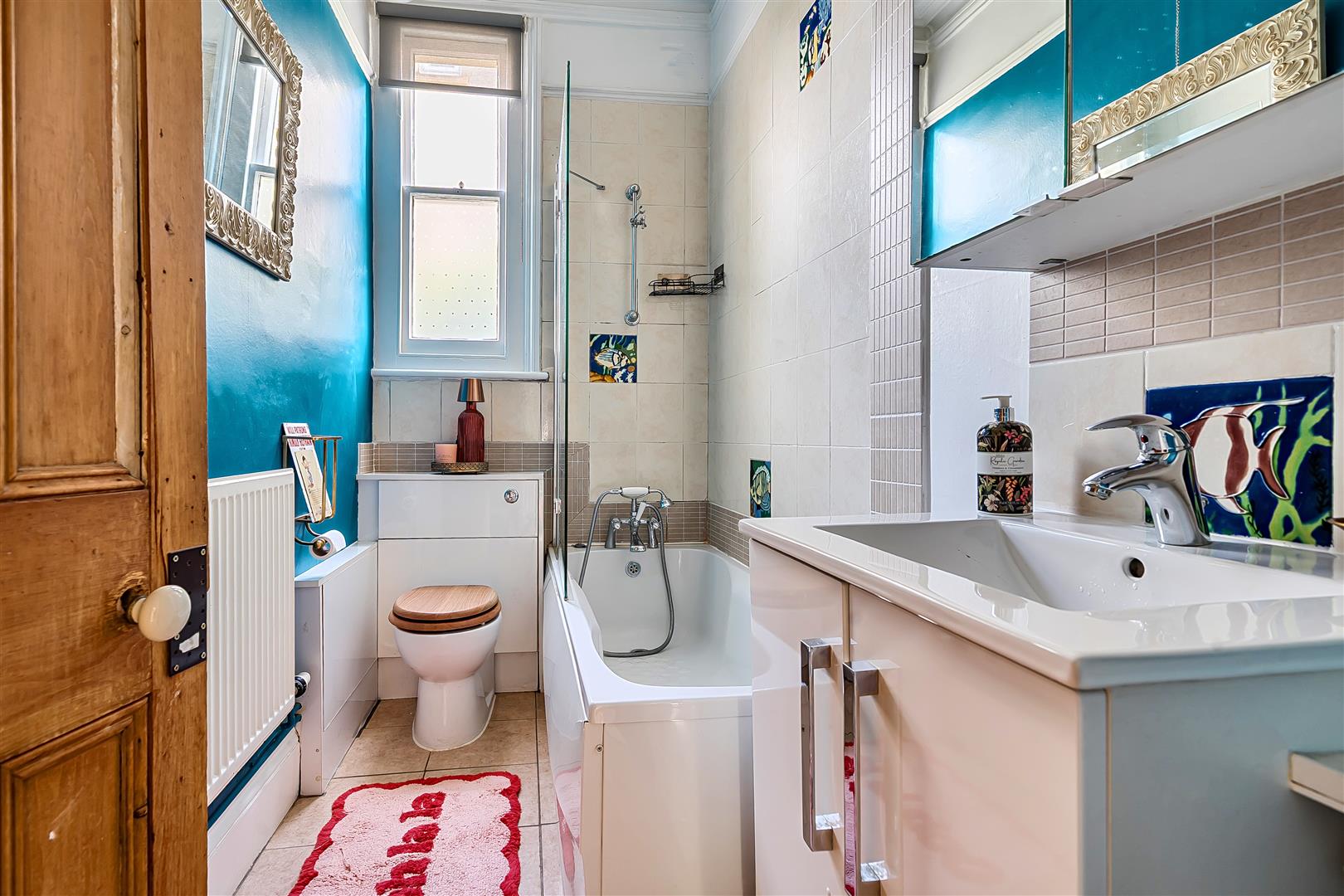 Bathroom - 2.7m x 1.4m (8'10" x 4'7" ) - Single glazed sash window to side aspect, panelled bath with taps and shower attachment over with glass shower panel, vanity basin unit with mixer tap over and a wall mounted mirrored shelving cupboard above. WC with hidden cistern, tiled walls to wet areas and tiled flooring. Picture rails and a radiator.