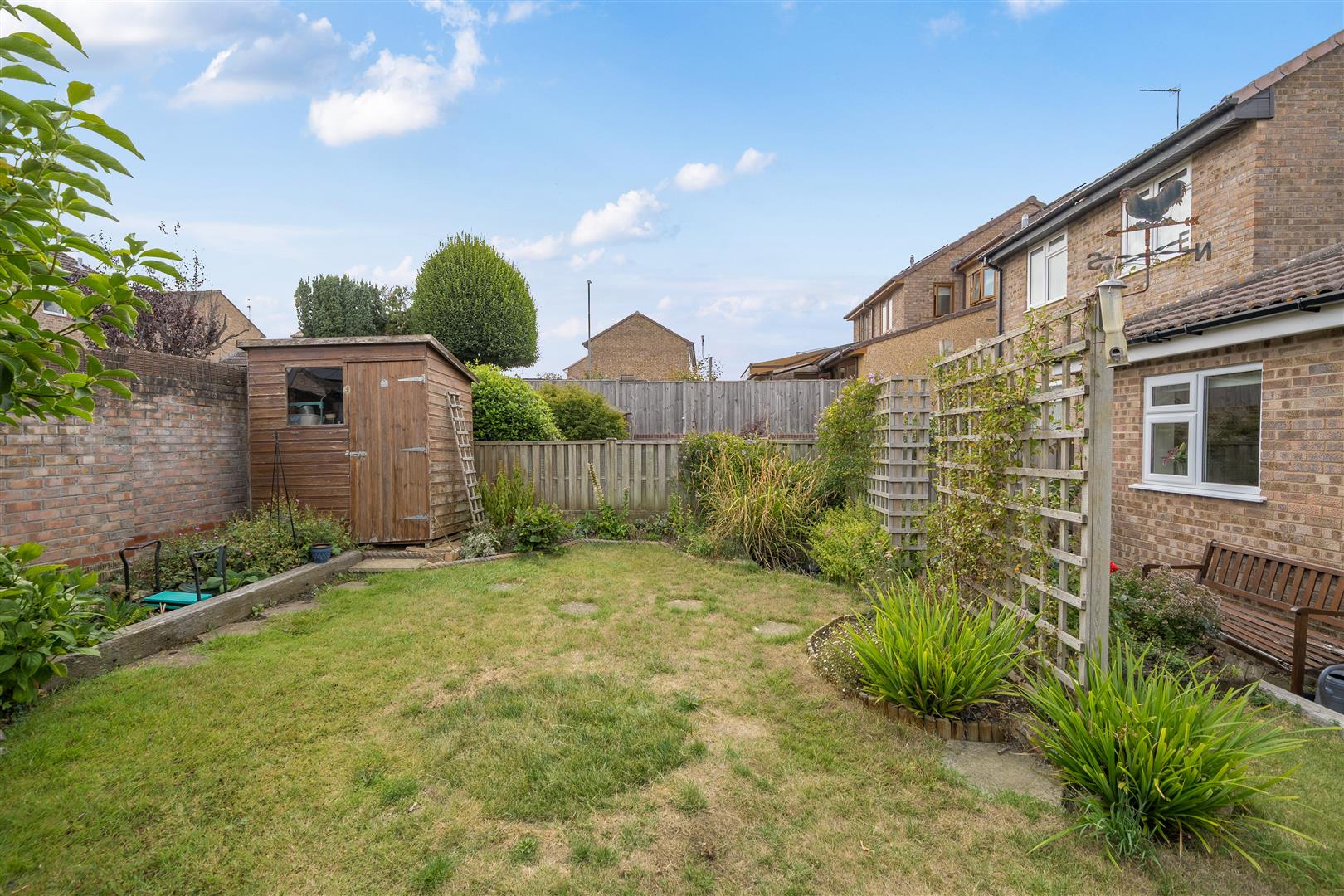 Rear Garden - Landscaped of mainly laid to lawn with a patio area for outdoor dining and a range of flower beds boasting a variety of plants and shrubbery. Trellis with clematis and a timber storage shed. Mainly brick wall boundaries with gated side access.