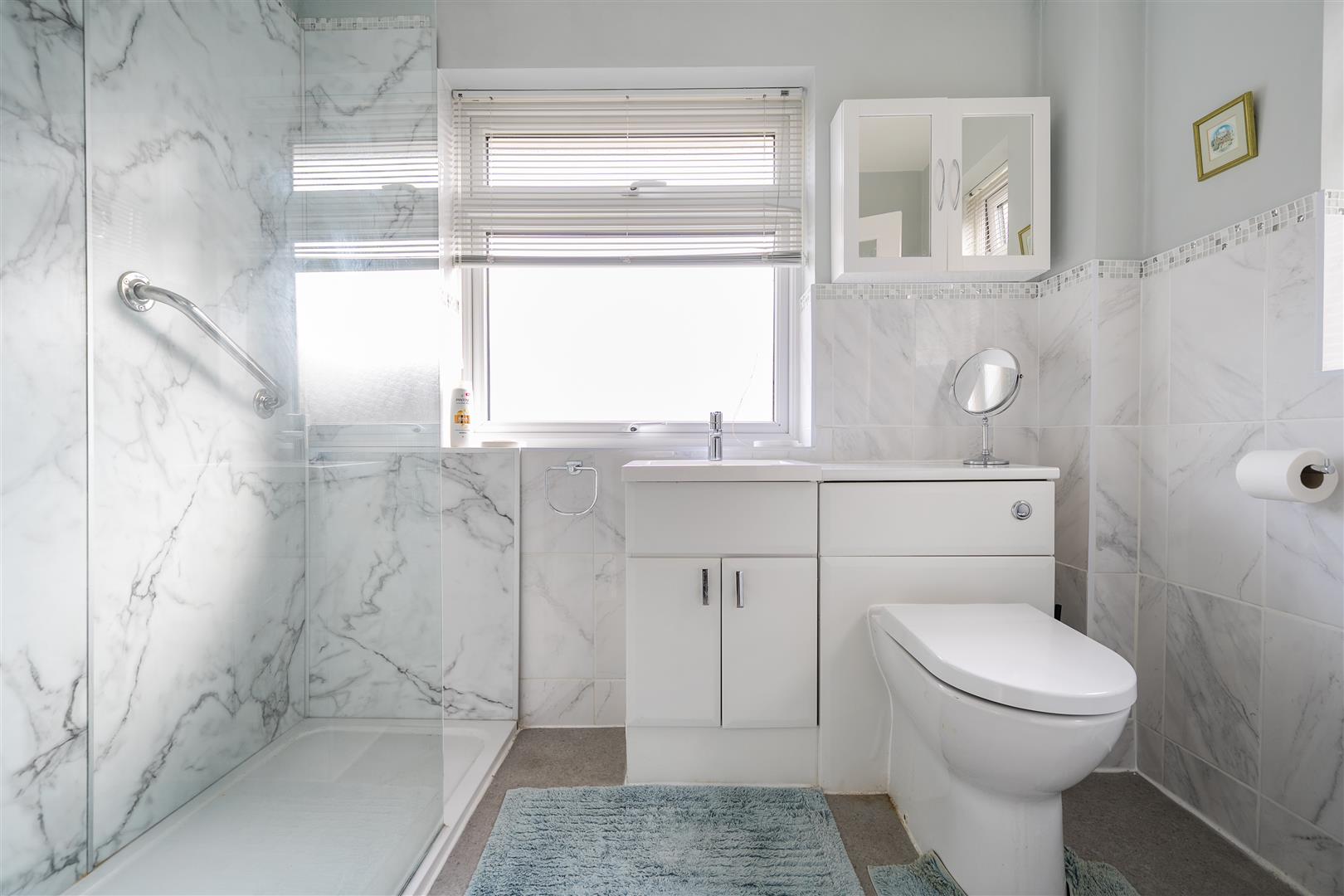Bathroom - 2.4m x 1.6m (7'10" x 5'2" ) - Double glazed obscured windows to rear and side aspect, walk in shower cubicle off mains with glass shower panel and marble effect splashback. Vanity unit with storage cupboard below, mixer tap over and a WC with hidden cistern. Half way tiled walls, spotlight lighting and a heated towel rail.