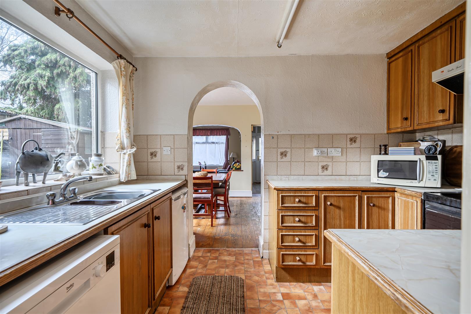 Kitchen - 3.2m x 2.3m (10'5" x 7'6") - Double glazed window to side aspect overlooking garden, kitchen comprising range of matching wall and base units with roll top work surfaces, bowl and a quarter stainless steel sink with mixer tap over. Space and electric supply for oven with extractor fan over, space and plumbing for dishwasher and low level fridge. Opening leading to rear lobby.