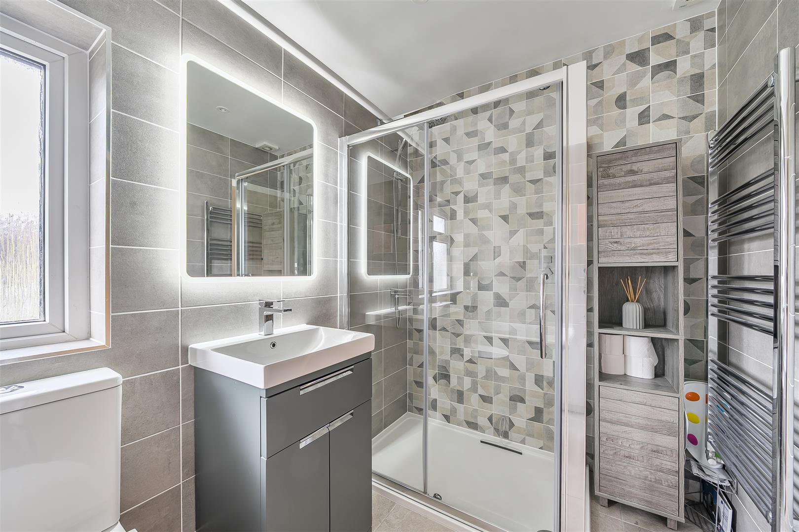 Bathroom - 2.9m x 1.7m (9'6" x 5'6" ) - Double glazed obscured window to rear aspect, panelled bath with mixer tap and shower attachment over, walk in shower cubicle with rainfall shower head, basin with storage below and a mixer tap over and a touch screen LED mirror above. Low level WC, fully tiled walls and flooring, spotlight lighting and a heated towel rail.