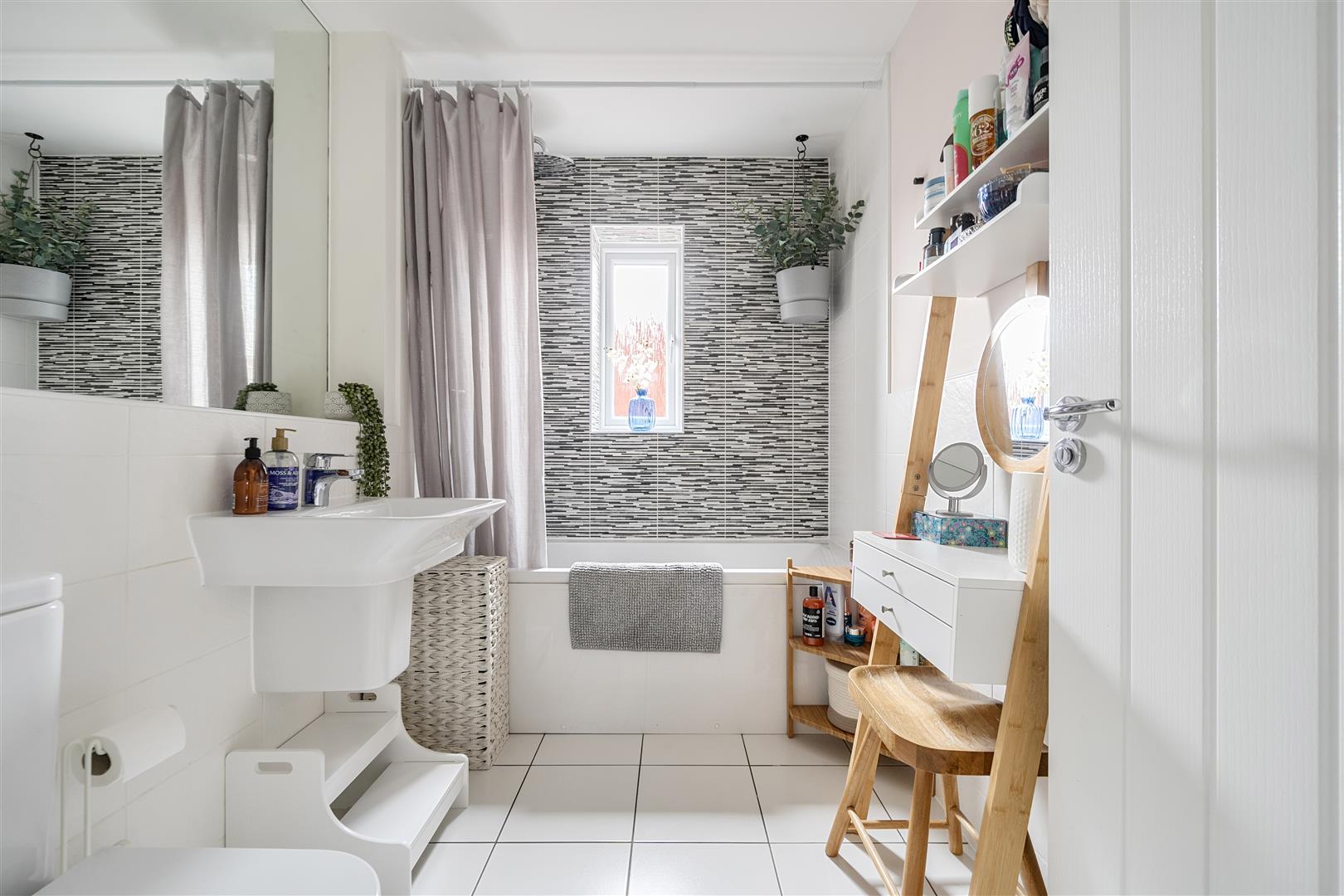 Bathroom - 2.5m x 1.6m (8'2" x 5'2" ) - Double glazed obscured window to side aspect, panelled bath with taps and shower off mains over, wash hand basin with mixer tap over and a low level WC. Tiled flooring and walls to wet areas with a tiled ledge and wall mounted mirror inset, spotlight lighting and a heated towel rail.