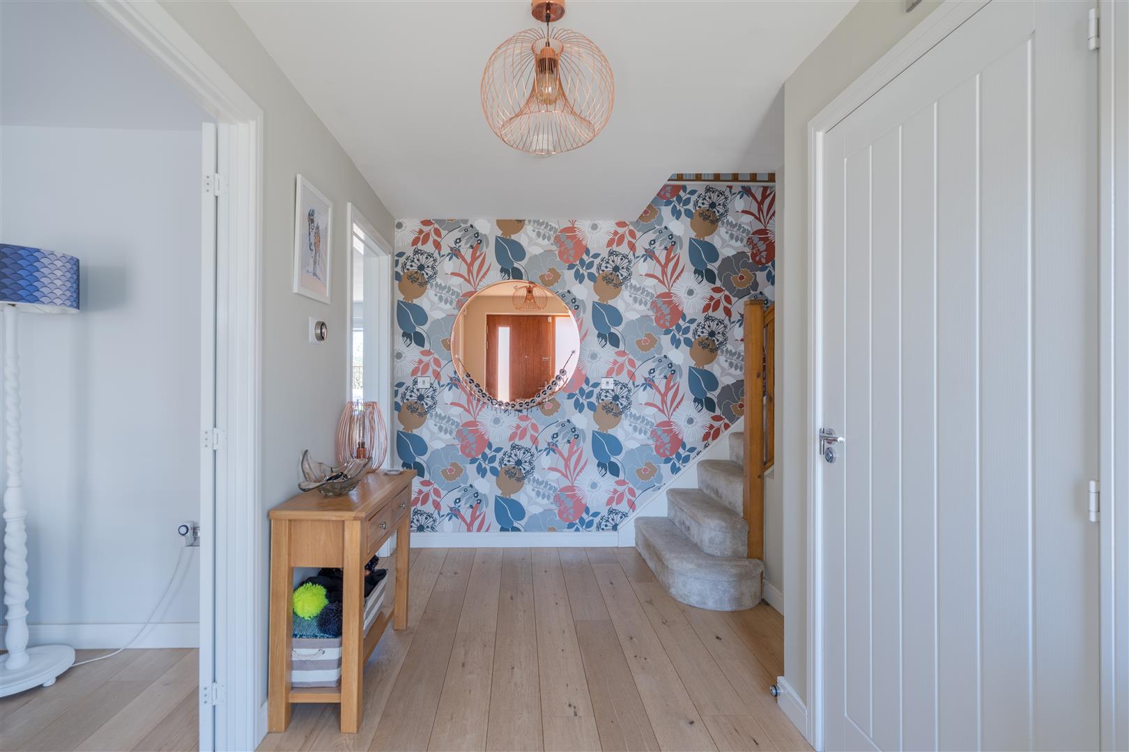 Upstairs, a striking galleried landing leads to four double bedrooms and a luxurious family bathroom. Three of the bedrooms benefit from floor-to-ceiling windows with far-reaching countryside views, while two enjoy en suite facilities. The master suite further impresses with a walk-in dressing room and private balcony.