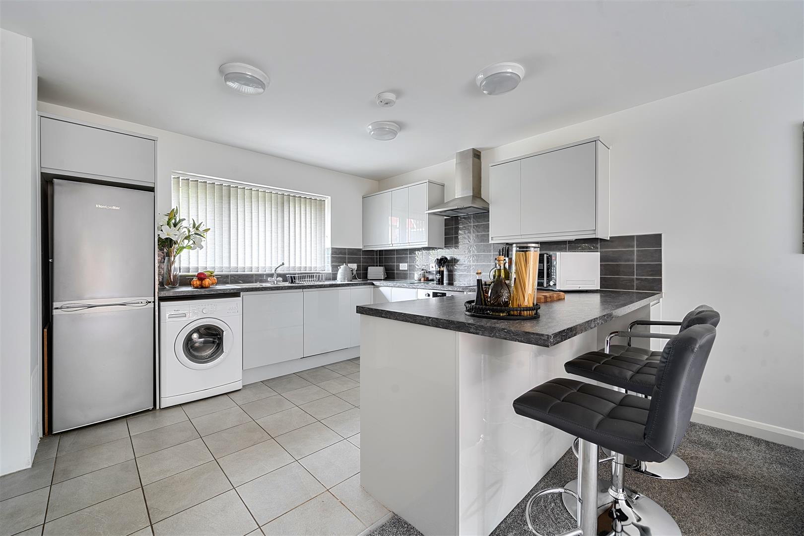 Lounge/Dining Room/Kitchen - 4.4m x 3.6m (14'5" x 11'9" ) - Dual aspect double glazed windows to front and rear aspects, double glazed French doors to rear aspect providing access to rear garden. Lounge/dining area offering ample space for family sized table and separate seating area, electric radiator, power points. Kitchen comprising range of matching wall and base units with roll top work surfaces, bowl and a quarter stainless steel sink with mixer tap over, integrated electric oven, four ring electric hob with extractor fan over, space and plumbing for washing machine and space and power for upright fridge/freezer, integrated dishwasher, breakfast bar, power points, tiled splashbacks to all wet areas.