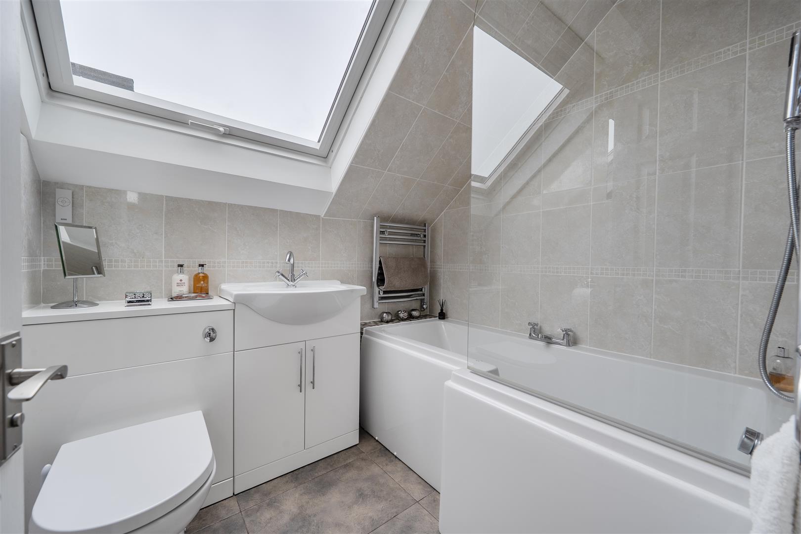 Bathroom - 2m x 1.8m (6'6" x 5'10" ) - Double glazed velux window with inset remote solar powered blind to roofline, matching three piece suite comprising wash hand basin in vanity unit with mixer tap over, hidden cistern WC, shower bath with mixer tap and dual head shower off mains supply over, heated towel rails, extractor fan, tiled splashbacks to all wet areas.