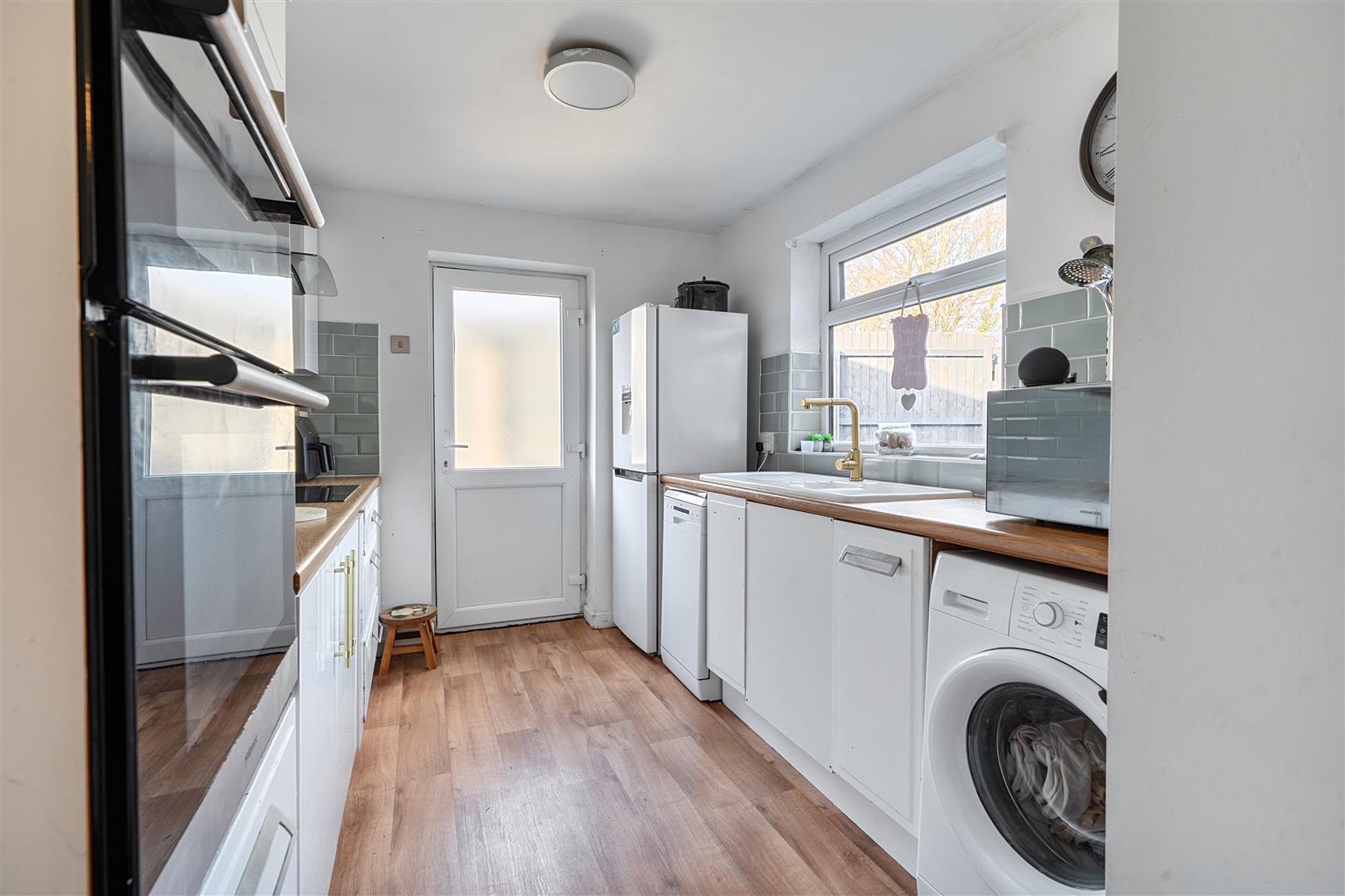 Kitchen - 4.2m x 2.4m (13'9" x 7'10") - Double glazed window and door to rear garden. Matching high gloss wall and base units with wood effect laminate work surfaces over and tiled splashbacks to area. Integrated double oven and electric hob with extractor hood over. Spaces and plumbing for both washing machine and dishwasher, one and a quarter porcelain sink with mixer tap over, radiator and power points.