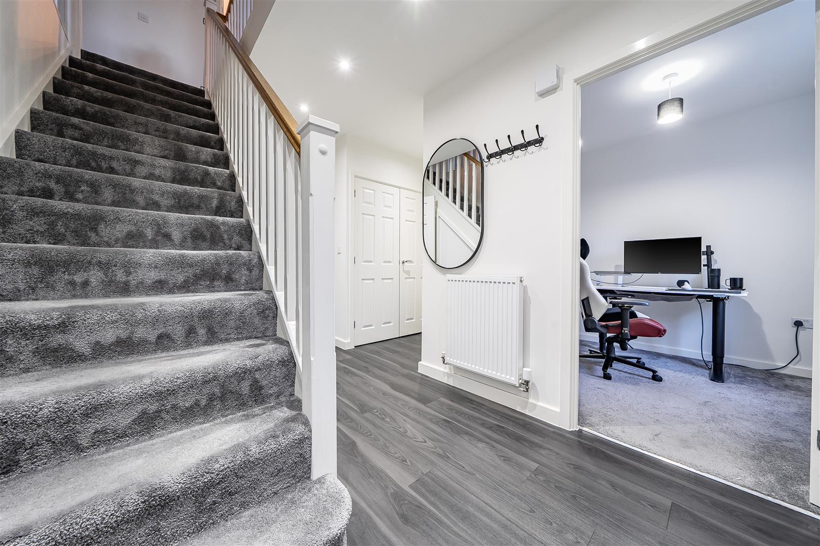 Entrance Hallway - 4m x 2.4m (13'1" x 7'10" ) - Two built in storage cupboards, walk in utility cupboard with space and plumbing for washing machine and tumble dryer, radiator, power points, stairs rising to first floor landing, doors leading to rooms.
