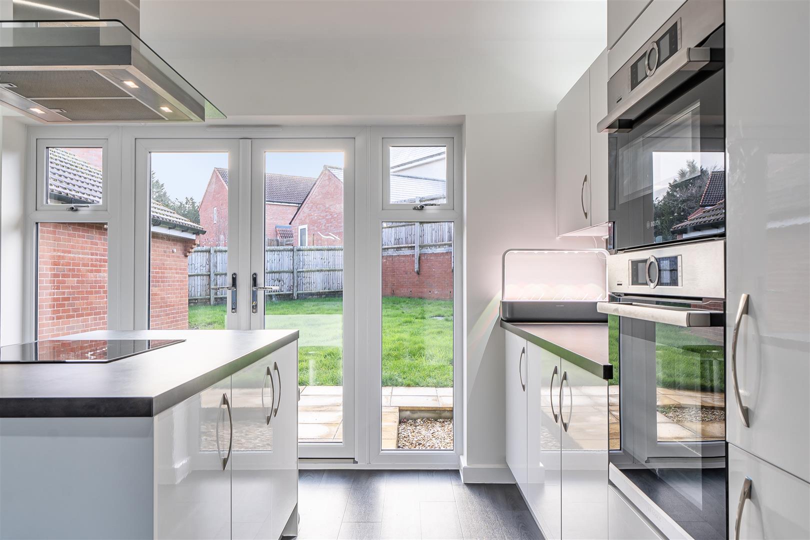 Kitchen/Dining/Family Room - 8.6m x 4.1m narrowing to 3.2m (28'2" x 13'5" narr - Dual aspect double glazed windows to front and rear aspects overlooking front and rear garden, double glazed door to side aspect leading to driveway, double glazed French doors to rear aspect overlooking and providing access to rear garden. High quality kitchen comprising range of matching soft close wall and base units with roll top work surfaces, bowl and a quarter sink with mixer tap over, range of integrated appliances including double electric Bosch oven and four ring induction hob with glass and stainless steel extractor fan over, integrated fridge/freezer, dishwasher and wall mounted gas combination boiler. Power points, centrepiece island, splashbacks to all wet areas. Dining and seating area offering ample space for family sized dining table and separate seating area, radiators, power points.