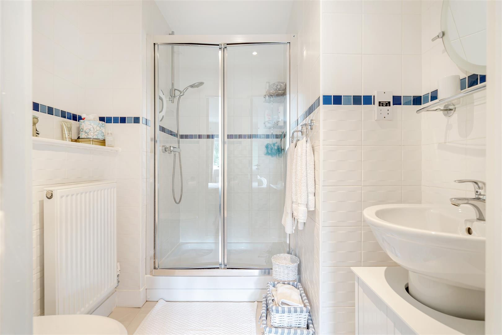 En Suite Shower Room - 2.4m x 2.1m narrowing to 1.7m (7'10" x 6'10" narr - Modern, matching three piece suite comprising pedestal wash hand basin with mixer tap over, hidden cistern WC and oversized walk in shower cubicle with shower off mains supply over, extractor fan, radiator, tiled splashbacks to all wet areas.