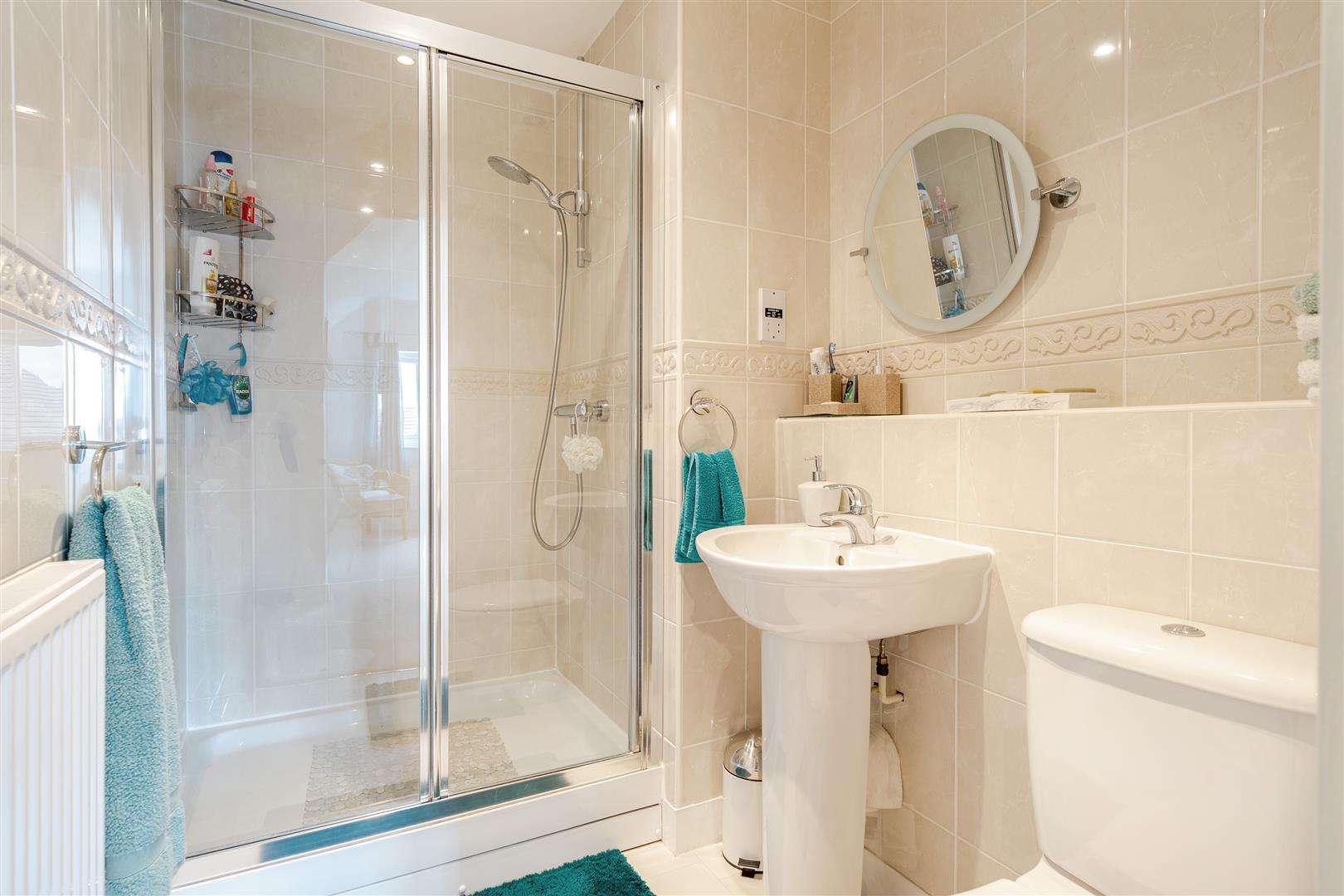 En Suite Shower Room - 2.4m x 1.6m narrowing to 1.3m (7'10" x 5'2" narro - Modern matching three piece suite comprising pedestal wash hand basin with mixer tap over, low level WC and oversized walk in shower cubicle with shower off main supply over, radiator, extractor fan, tiled splashbacks to all wet areas.