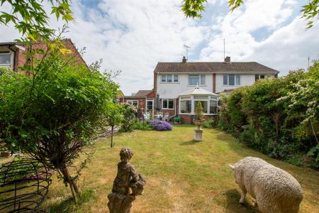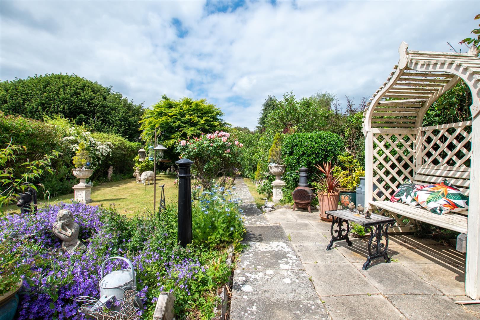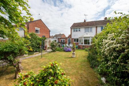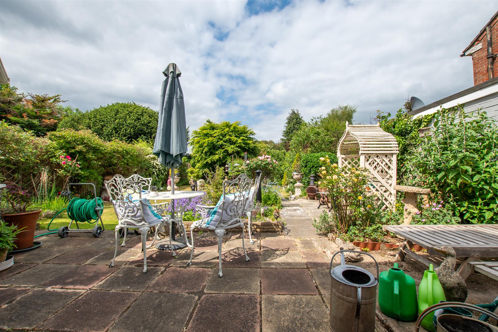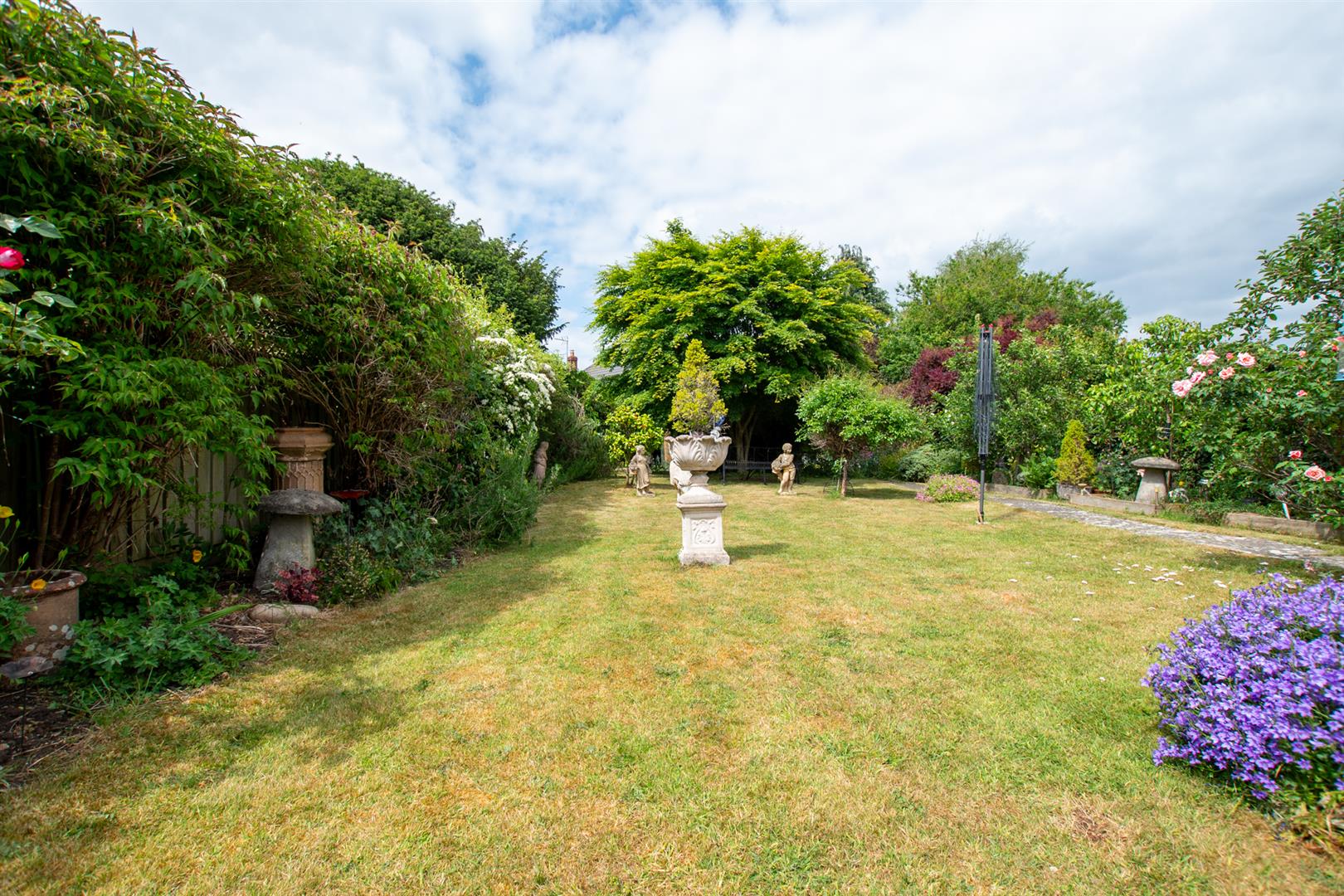 Rear Garden - Enclosed by hedge and fence surround. In large laid to lawn with a patio area, planted borders with flower and shrubs, a mixture of apple trees and a hidden seating area laid to shingle next to the wooden shed.