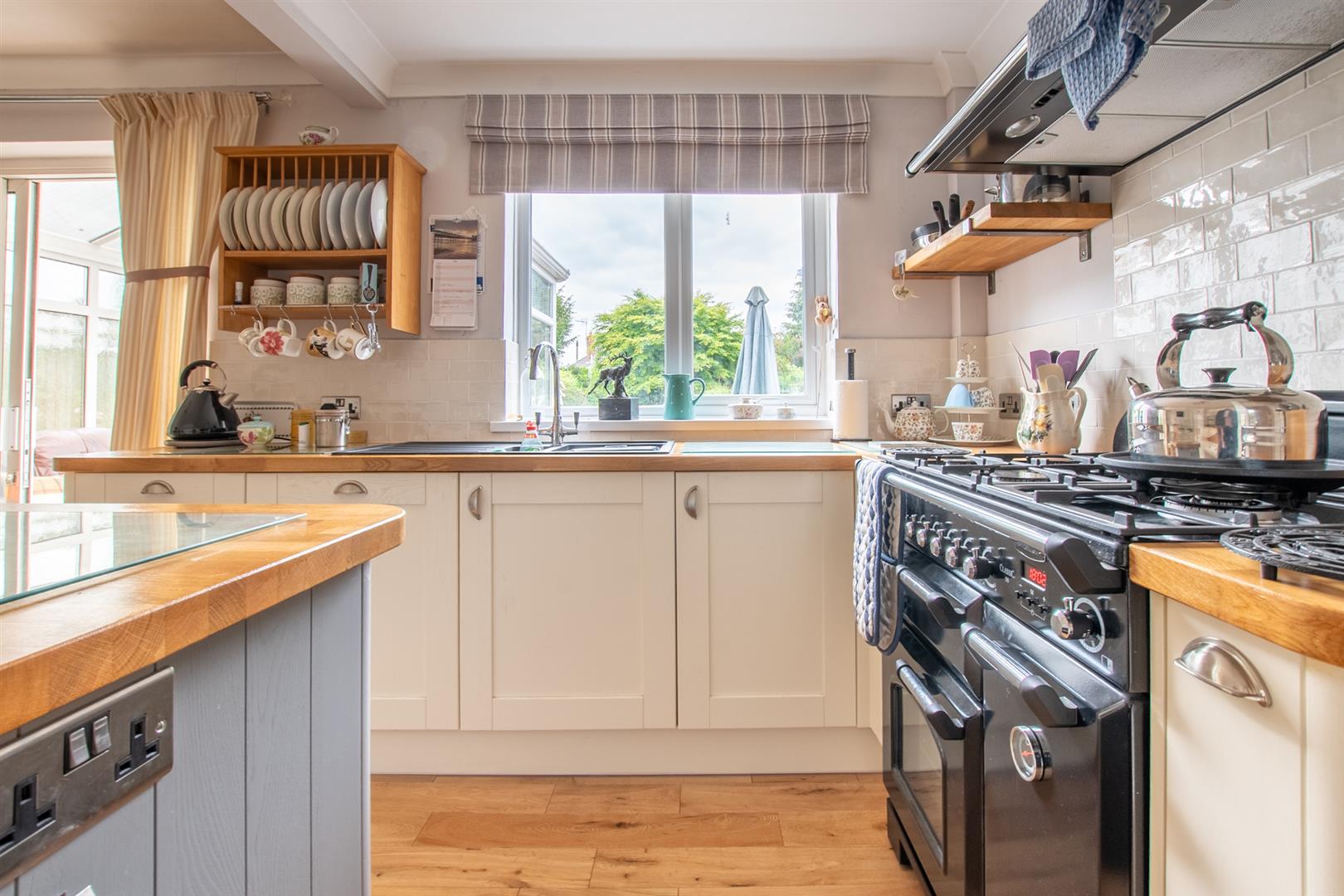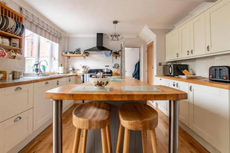 Kitchen/Dining Room - 5,77m x 3.41m (16'4",252'7" x 11'2" ) - Double glazed window and sliding doors to the rear aspect, double glazed door to the side aspect, French doors leading in from the living room, recessed spot lights, a range of wall and base units with tiled splash backs and wooden work surfaces, composite sink/drainer unit with mixer tap, integral dish washer, space for a range style cooker with an extractor hood over. Separate island with matching units and wooden surfaces, including integral fridge and freezer. Television point, radiator and oak flooring.