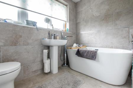 Bathroom - 2.47m x 1.97m (8'1" x 6'5" ) - Double glazed obscure window to the rear aspect, recessed spot lights, low level WC, pedestal wash hand basin., shower cubicle with electric shower over, free standing bath with shower attachment, chrome towel radiator, tiled walls and tiled flooring.
