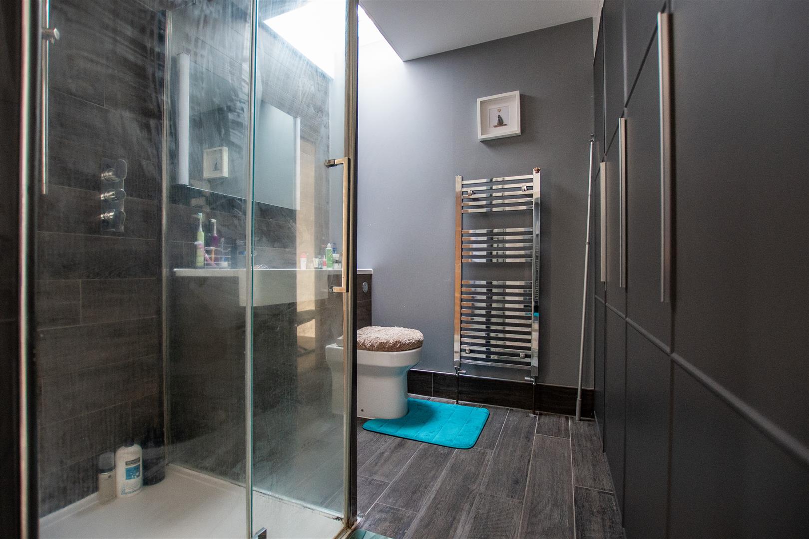 Ensuite - Sky light. Shower with glass sliding door. Enclosed coupled toilet and a vanity basin. Heated towel rail. Tiled floor part tiled walls.